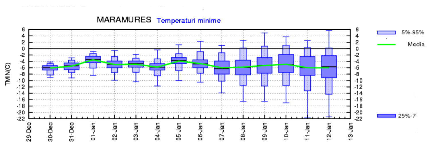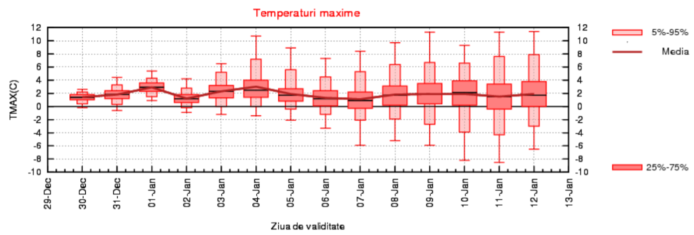 Temperaturi. Valorile de temperatură vor avea ușoare variații de la o zi la alta, dar în mare parte din cele două săptămâni de referință se vor situa în jurul celor climatologic specifice în această perioadă din an, cu maxime, în medie, de 1-3 ͦ C și minime de – 5 ͦ C, – 3 ͦ C. Temperaturi diurne ușor mai ridicate vor fi posibile în jurul datei de 4 ianuarie și, din nou, în perioada 8 -10 ianuarie.
