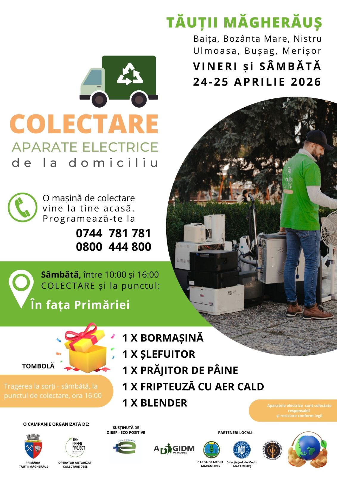 Locuitorii orașului Tăuții-Măgherăuș pot participa, în perioada 24–25 aprilie, la o amplă campanie de colectare a deșeurilor electrice și electrocasnice, organizată pentru a încuraja reciclarea responsabilă și protejarea mediului.