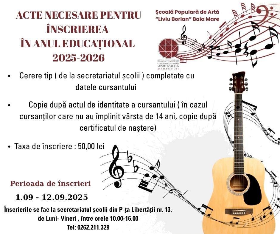 Școala Populară de Artă Baia Mare anunță că în curând încep înscrierile pentru anul școlar 2025-2026, acestea desfășurându-se în perioada 1 – 12 septembrie.