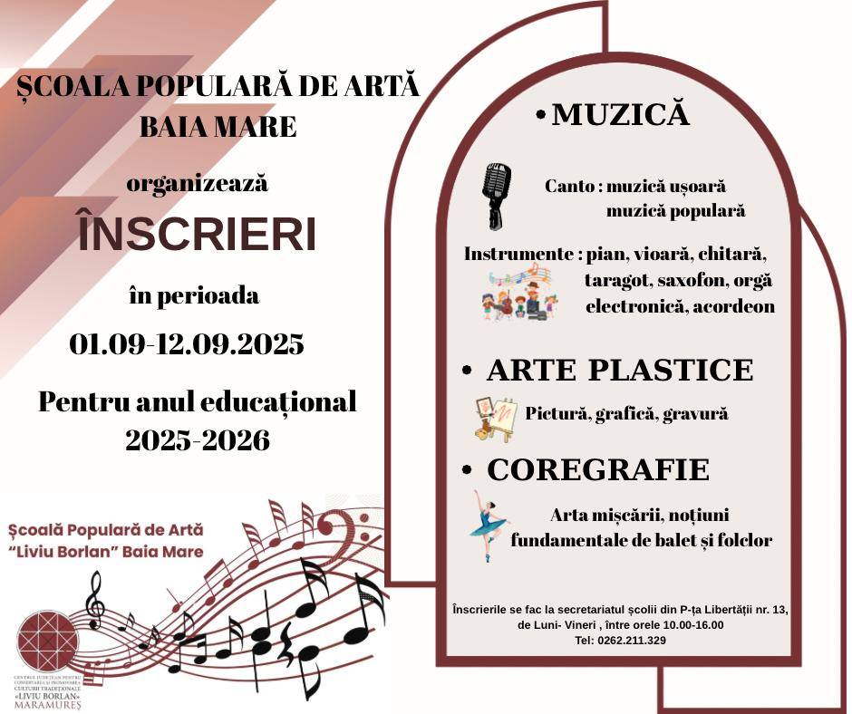 Școala Populară de Artă Baia Mare anunță că în curând încep înscrierile pentru anul școlar 2025-2026, acestea desfășurându-se în perioada 1 – 12 septembrie.