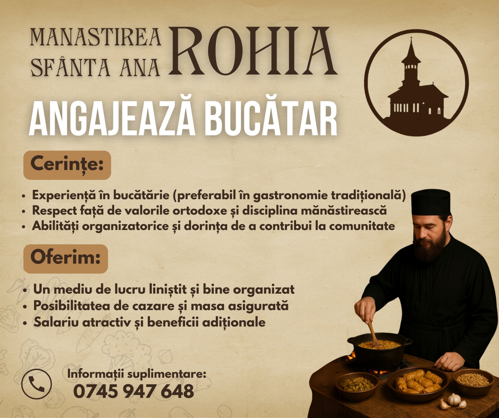 Mănăstirea „Sfânta Ana” Rohia anunță că angajează bucătar.