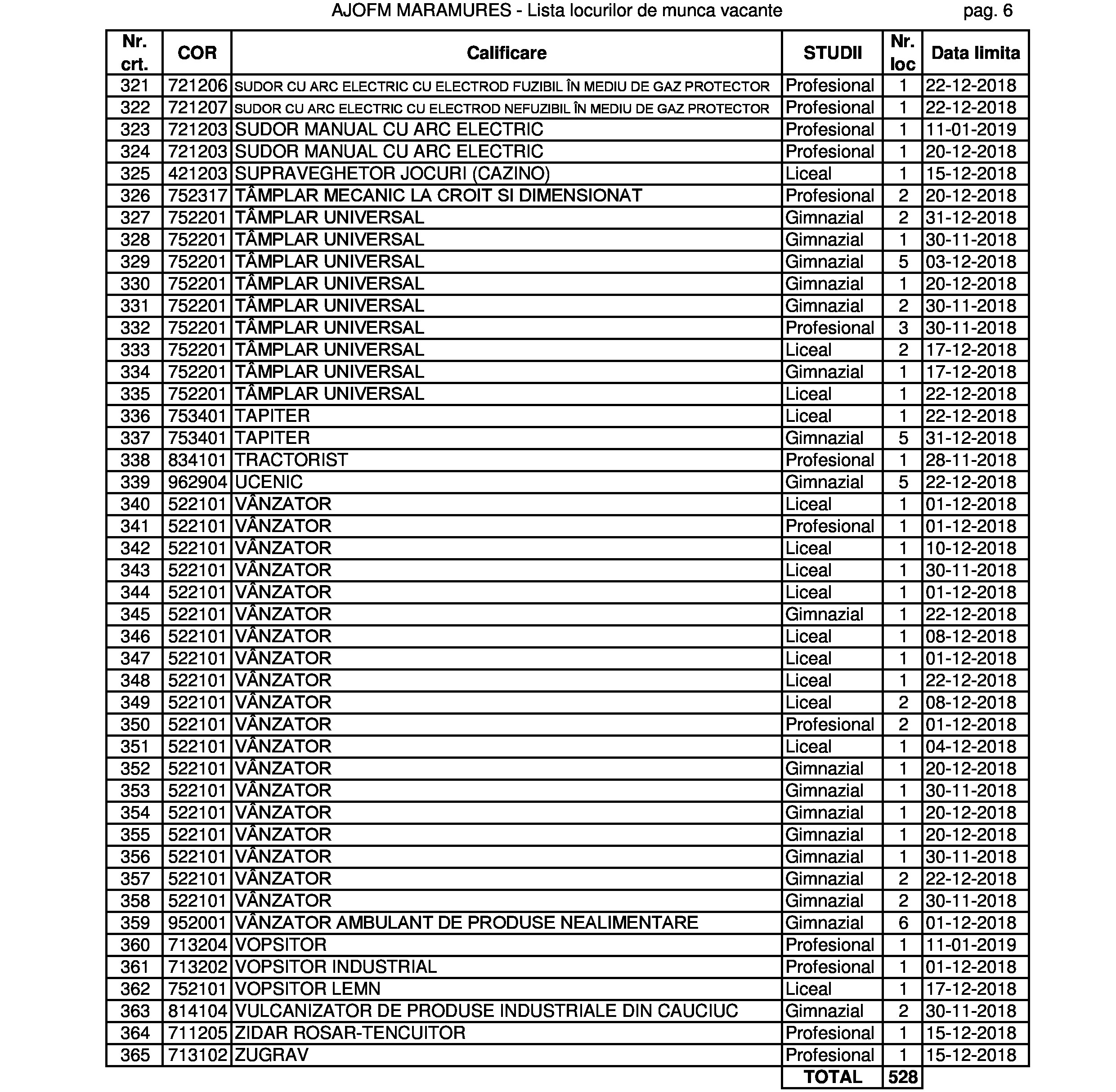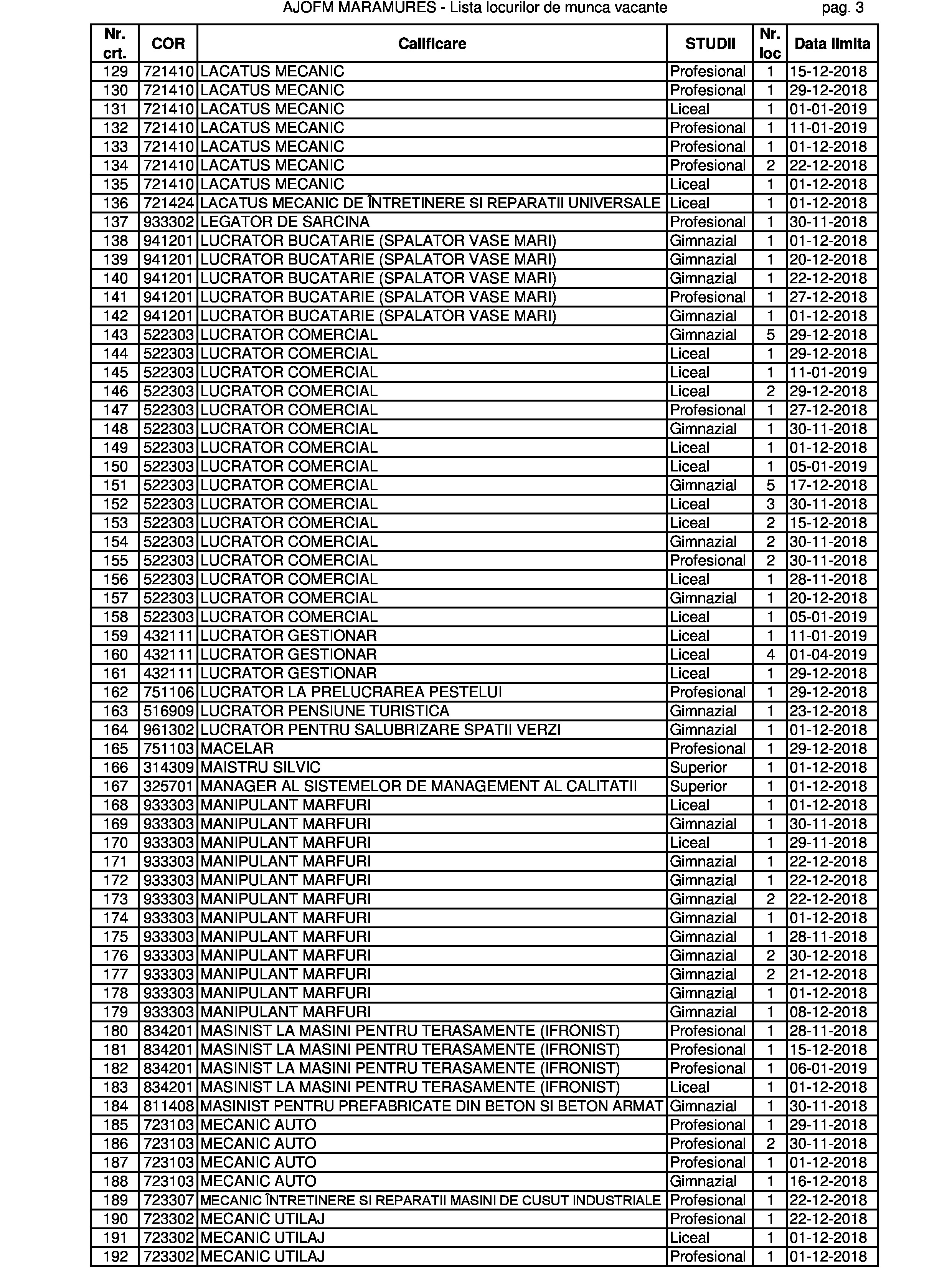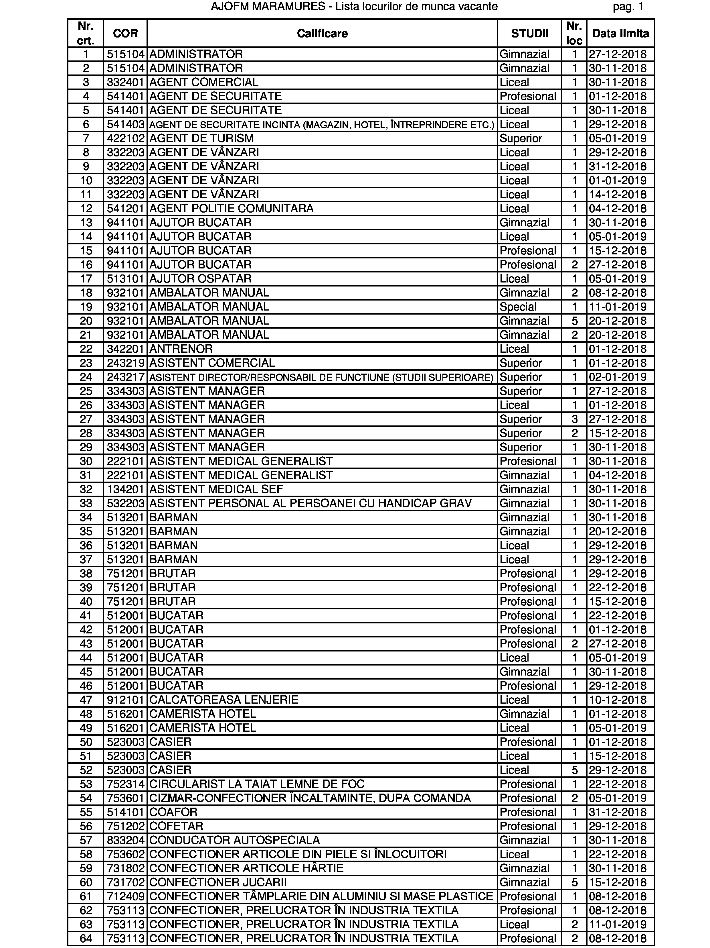 Cea mai recentă ofertă a AFOFM Maramureș cuprinde 528 de locuri. Studiile liceale sunt cele care oferă plaja cea mai largă de joburi: de la muncitor necalificat, la lucrător la spații verzi, ajutor de bucătar sau de ospătar, barman, călcătoreasă de lenjerie, cameristă, femeie de serviciu, paznic, gestionar, casier, contabil, până la director adjunct sau director. Te poți descurca bine și cu studiile gimnaziale, care sunt suficiente pentru a ocupa un post de director de societate comercială. Vezi oferta detaliată și ușor de parcurs.