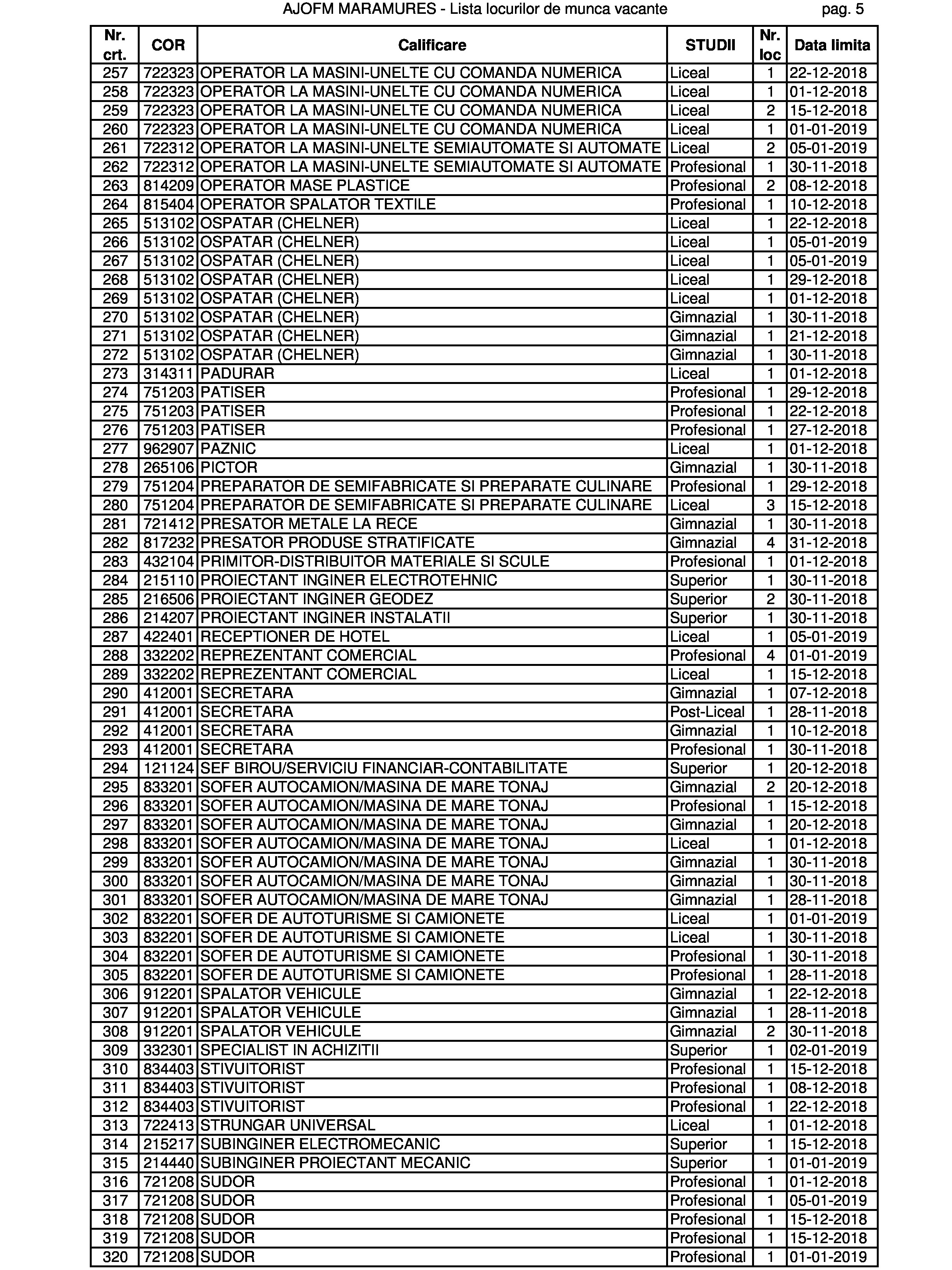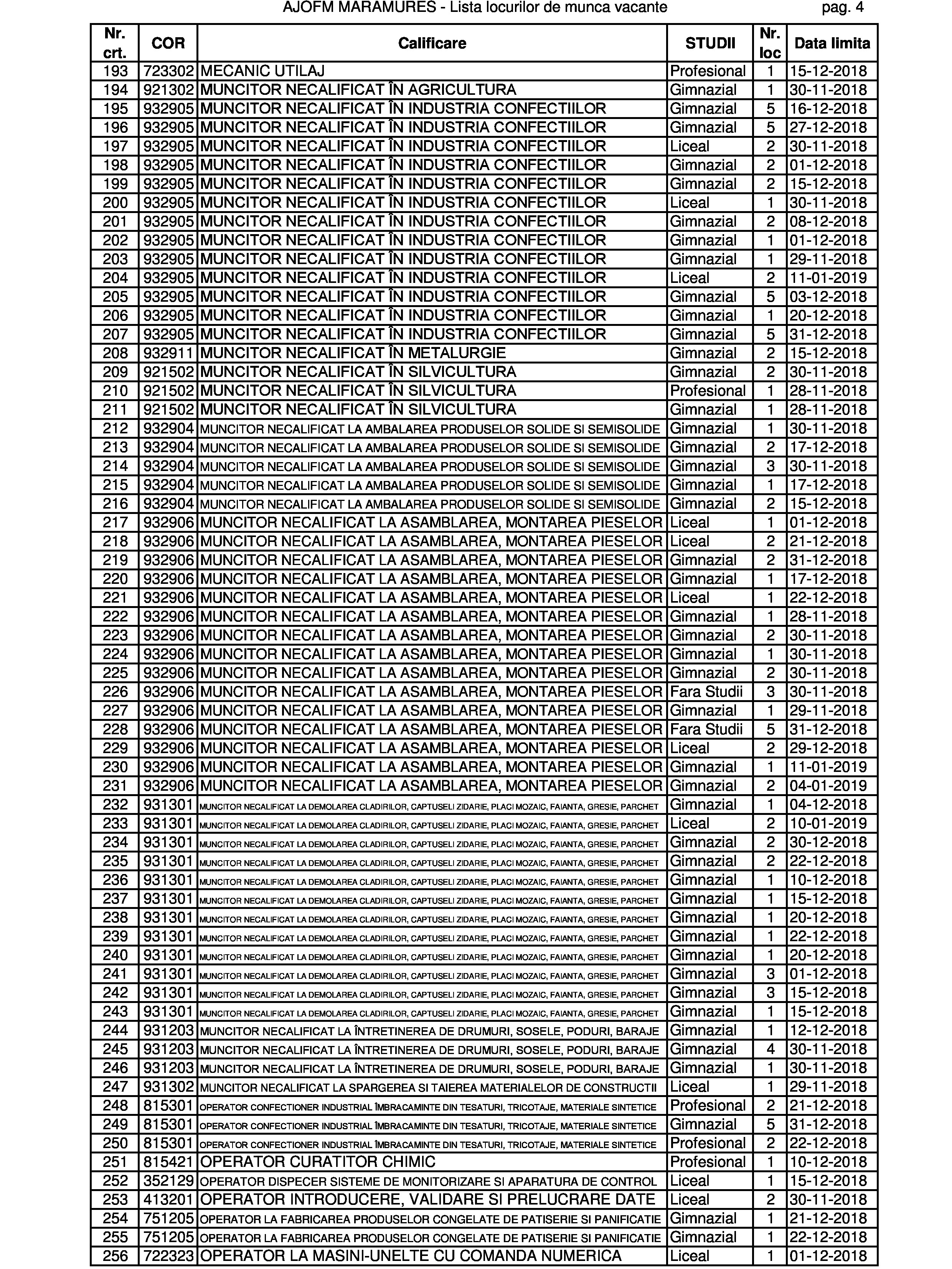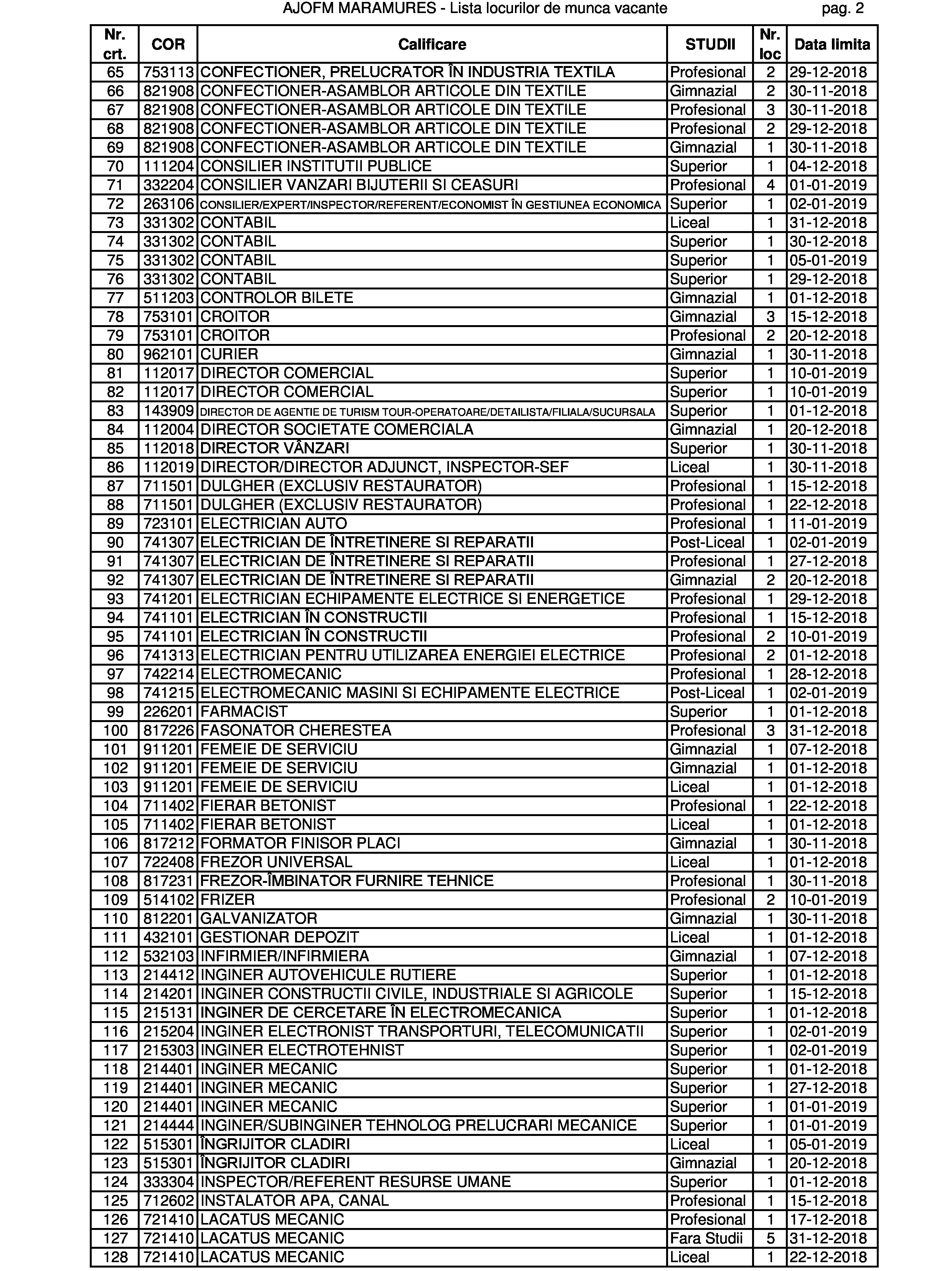 Cea mai recentă ofertă a AFOFM Maramureș cuprinde 528 de locuri. Studiile liceale sunt cele care oferă plaja cea mai largă de joburi: de la muncitor necalificat, la lucrător la spații verzi, ajutor de bucătar sau de ospătar, barman, călcătoreasă de lenjerie, cameristă, femeie de serviciu, paznic, gestionar, casier, contabil, până la director adjunct sau director. Te poți descurca bine și cu studiile gimnaziale, care sunt suficiente pentru a ocupa un post de director de societate comercială. Vezi oferta detaliată și ușor de parcurs.