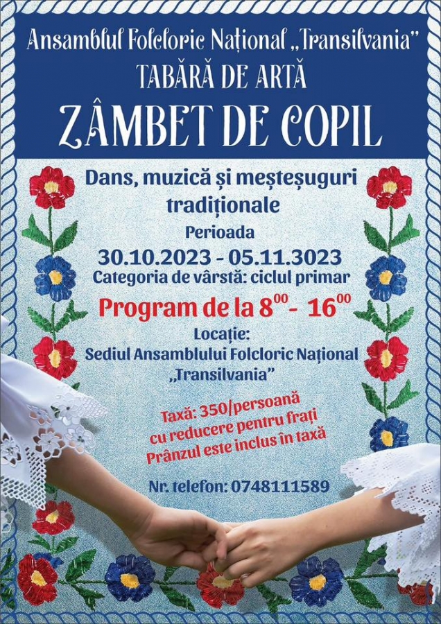 Ansamblul Folcloric Național „Transilvania” organizează Tabăra de artă „Zâmbet de copil” în vacanța intermodulară din această toamnă (30 octombrie – 5 noiembrie). Aceasta se adresează elevilor din ciclul primar.