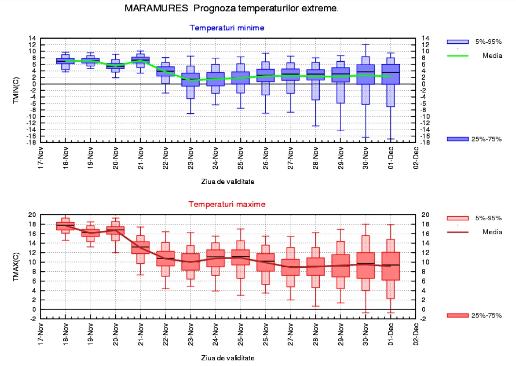 Până în 21 noiembrie, în Maramureş vremea va fi mai caldă decât în mod normal și, în medie, se vor înregistra temperaturi maxime în jurul a 17 grade. Apoi vremea se va răci, maximele urmând a scădea spre temperaturi în jurul a 10 – 11 ͦ C în 23 noiembrie. Până la sfârşitul intervalului de prognoză, variaţiile de la o zi la alta nu vor fi notabile, astfel că ecartul mediu regional va fi cuprins între 9 şi 11 ͦ C. În ceea ce priveşte regimul termic nocturn, în intervalul 18- 21 noiembrie se vor înregistra temperaturi cuprinse, în medie, între 6 şi 8 ͦ C, apoi este estimată o răcire a vremii spre valori medii situate în jurul a 1 – 3 ͦ C.