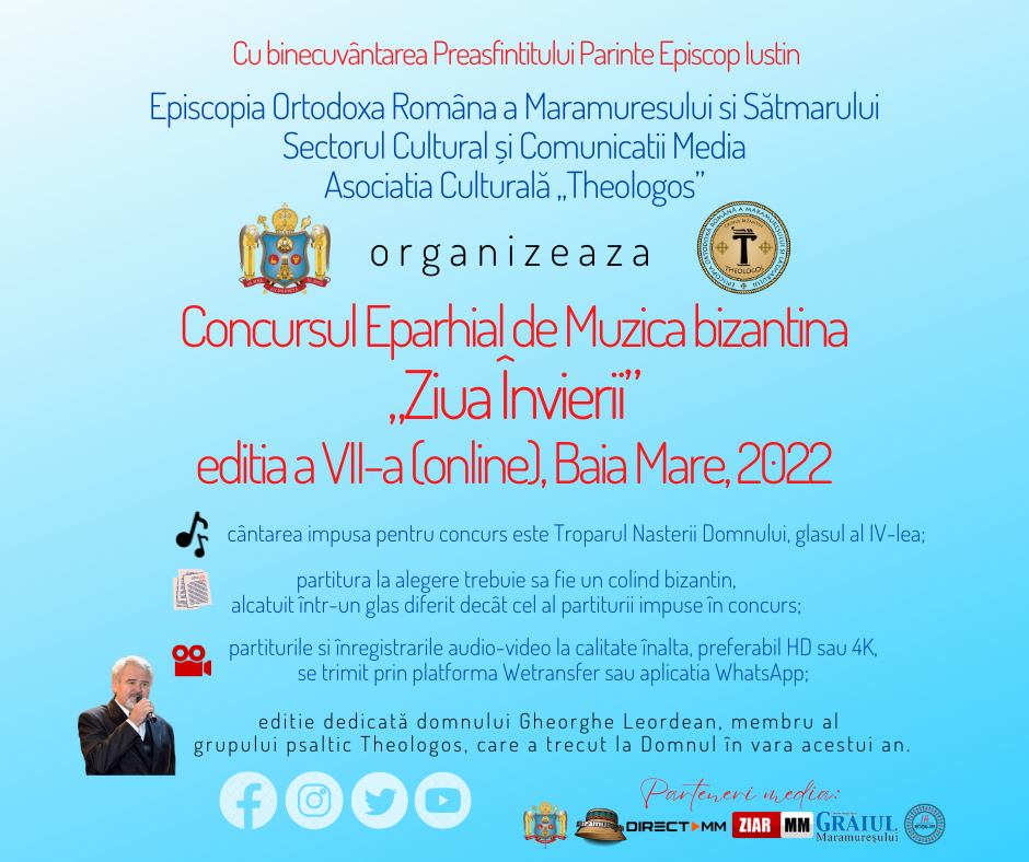 Cu binecuvântarea Preasfințitului Părinte Iustin, Episcopul Maramureșului și Sătmarului, Sectorul Cultural și Comunicații Media, în parteneriat de colaborare cu Asociația Culturală „Theologos”, lansează a VII-a ediție consecutivă a Concursului Eparhial de Muzică bizantină „Ziua Învierii” (online).
