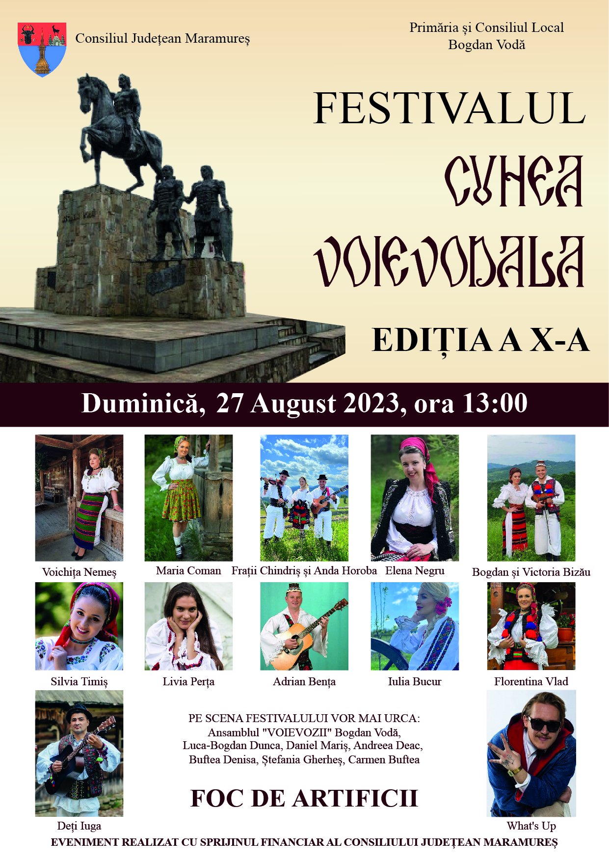 Manifestarea începe la ora 13.00. Pe scenă vor urca: Voichiţa Nemeş, Maria Coman, Fraţii Chindriş şi Anda Horoba, Elena Negru, Bogdan şi Victoria Bizău, Silvia Timiş, Livia Perţa, Adrian Benţa, Iulia Bucur, Florentina Vlad, Deţi Iuga, Ansamblul Voievozii Bogdan Vodă, Luca-Bogdan Dunca, Daniel Mariş, Andreea Deac, Buftea Denisa, Ştefania Gherheş, Carmen Buftea şi What’s Up.