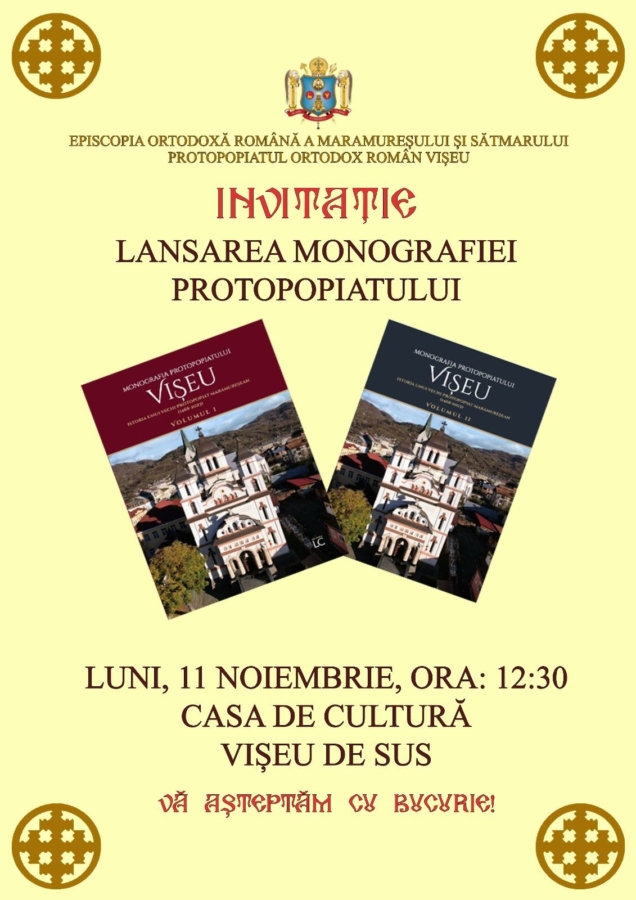 „Cu binecuvântarea și prezența Preasfințitului Părinte Iustin, Episcopul Maramureșului și Sătmarului și a domnului Răzvan Bucuroiu, vă invităm la lansarea volumelor Monografia Protopopiatului Vișeu – Istoria unui vechi protopopiat maramureșean (1468-2023), care se va desfășura luni, 11 noiembrie, ora 12:30, la Casa de Cultură Vișeu de Sus.