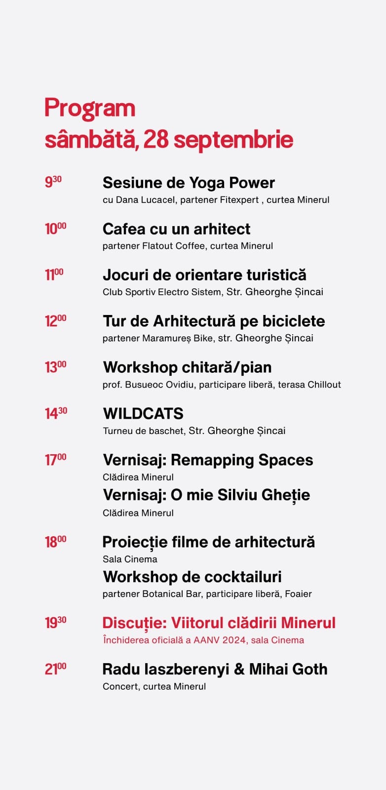 Colegiului de Arte Baia Mare . De asemenea, se vor organiza vernisaje ale unor lucrări de artă, de fotografie cât și o seară de filme de arhitectură, aducând împreună comunitatea locală și nu numai. Spectacolul Teatrului Municipal Baia Mare, ”Șantier”, în regia lui Victor Olăhuț, se va juca în curtea clădirii fostului Complex Minerul.