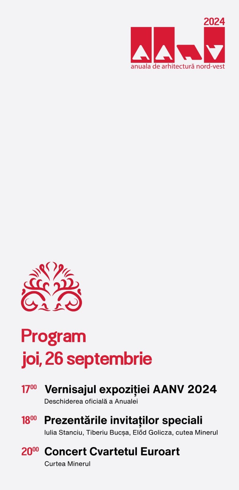 Programul include deschiderea oficială, vernisaje, prezentări și workshop-uri variate, oferind oportunități de interacțiune și învățare pentru participanți de toate vârstele. Evenimentul va include vernisarea lucrărilor membrilor Filialei Nord Vest a Ordinului Arhitecților din România din ultimul an. Juriul AAnv2024 este format din speciali, arhitecții Iulia Stanciu, Tiberiu Bucșa și Előd Golicza, care vor susține și propriile prezentări.