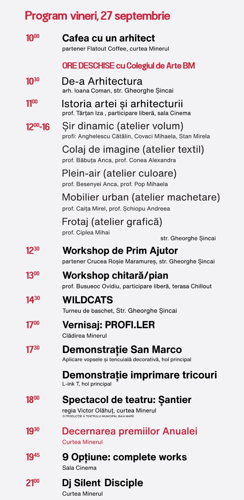 Colegiului de Arte Baia Mare . De asemenea, se vor organiza vernisaje ale unor lucrări de artă, de fotografie cât și o seară de filme de arhitectură, aducând împreună comunitatea locală și nu numai. Spectacolul Teatrului Municipal Baia Mare, ”Șantier”, în regia lui Victor Olăhuț, se va juca în curtea clădirii fostului Complex Minerul.