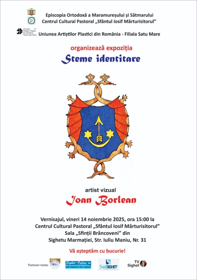 Vineri, 14 noiembrie 2025, de la ora 15:00, va avea loc vernisajul expoziției „Steme identitare”, semnată de artistul vizual Ioan Borlean. Evenimentul se va desfășura la Sala „Sfinții Brâncoveni” de la etajul 2 al Centrului Cultural Pastoral „Sfântul Iosif Mărturisitorul”.