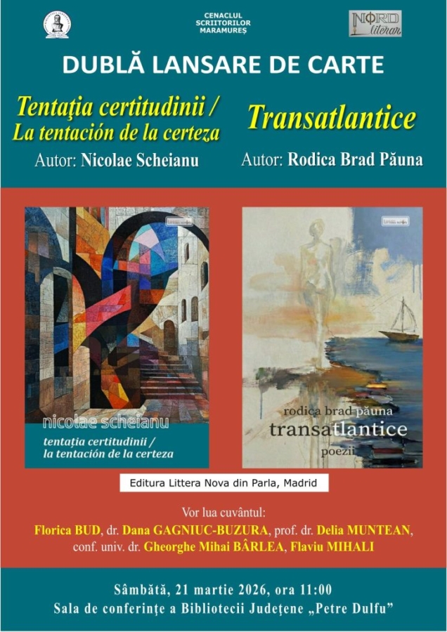 Sâmbătă, 21 martie, începând cu ora 11:00, Biblioteca Județeană „Petre Dulfu” din Baia Mare va găzdui, în Sala de Conferințe, lansarea cărților „Tentația certitudinii”, un volum bilingv (română-spaniolă) de poezie semnat de Nicolae Scheianu și „Transatlantice”, semnat de Rodica Brad-Păuna, ambele apărute la Editura Littera Nova din Parla, Madrid.