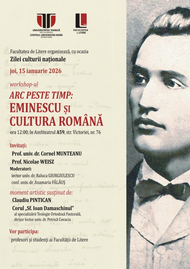 Facultatea de Litere a Centrului Universitar Nord Baia Mare din cadrul Universității Tehnice din Cluj-Napoca organizează joi, 15 ianuarie 2026, workshopul „Arc peste timp: Eminescu și Cultura Română”, un eveniment devenit deja o tradiție în mediul academic, care îl sărbătorește pe poetul Mihai Eminescu de Ziua Culturii Naționale. Evenimentul va avea loc de la ora 12:00 în Amfiteatrul A59 al Facultății de Litere.