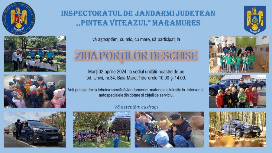 Marți, 2 aprilie, între orele 10.00 și 14.00, la Inspectoratul de Jandarmi Județean „Pintea Viteazul” Maramureș va avea loc Ziua Porților Deschise.