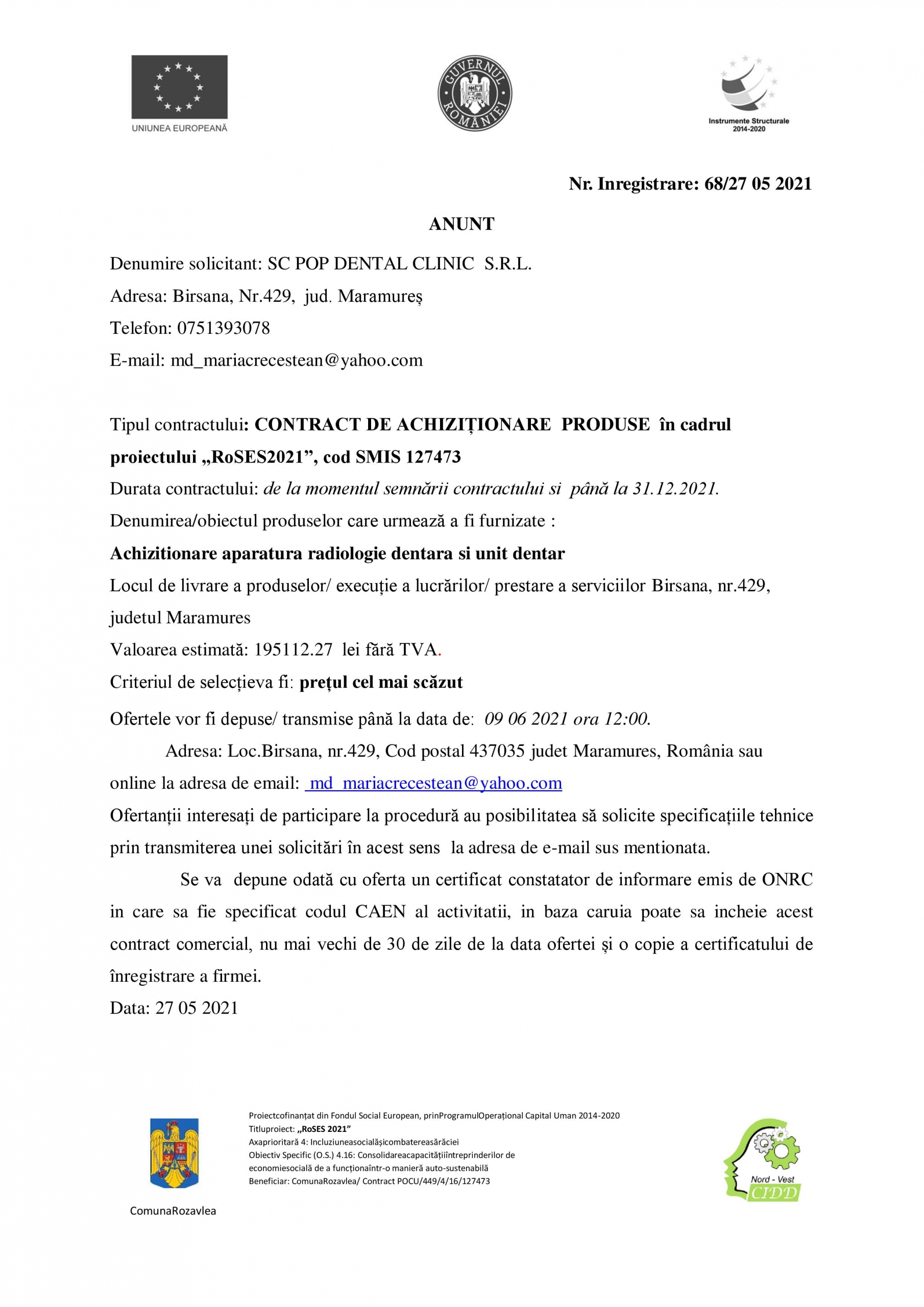 Anunț: Contract de achiziționare produse în cadrul proiectului „RoSES2021”, cod SMIS 127473