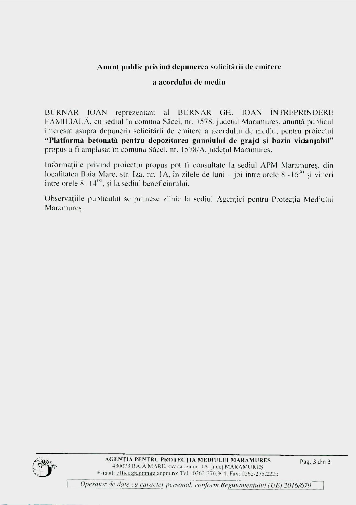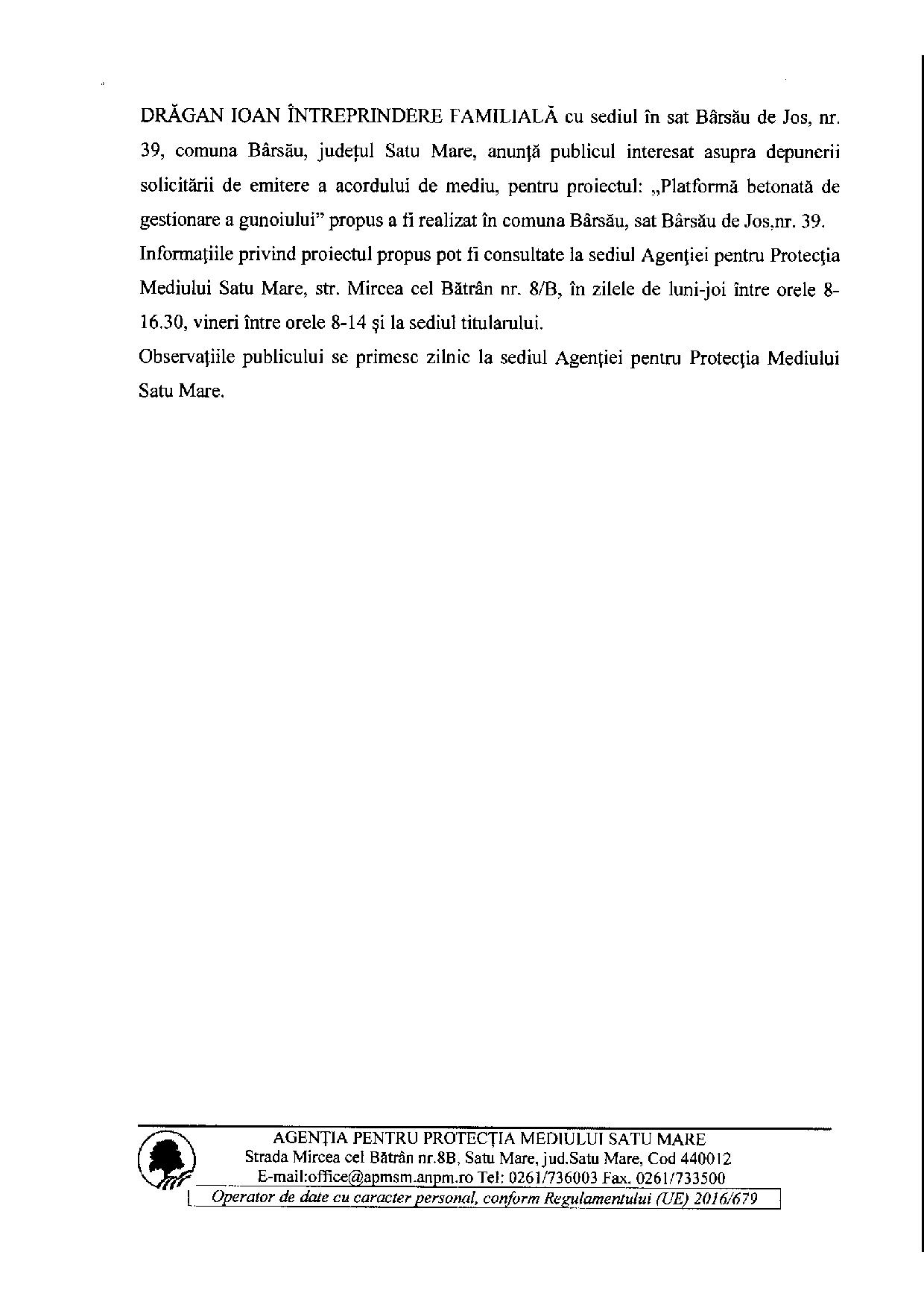 Anunţ public privind depunerea solicitării de emitere a acordului de mediu SC SEBI MARC…