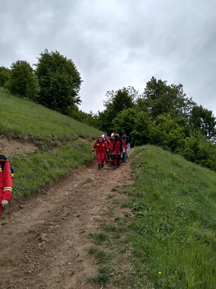 112: Un bărbat din Vișeu de Jos s-a rănit la picior în vârfului dealului. A fost transportat de forțele de intervenție până la ambulanță (GALERIE FOTO)