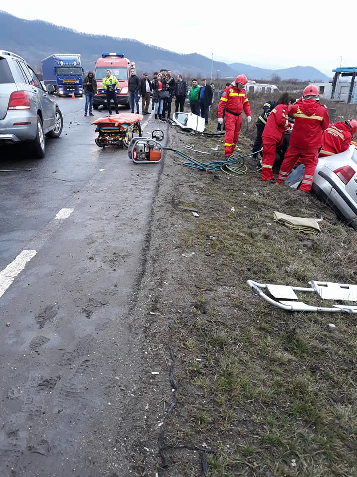 Accident cu doi răniți și o mașină răsturnată în șanț