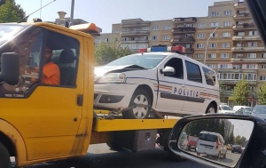 O mașină a poliției s-a ”pupat” vineri, în intersecția bulevardelor Traian și Republicii din Baia Mare, cu un alt autoturism. S-a cam lăsat cu niște tablă îndoită.