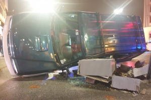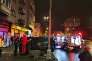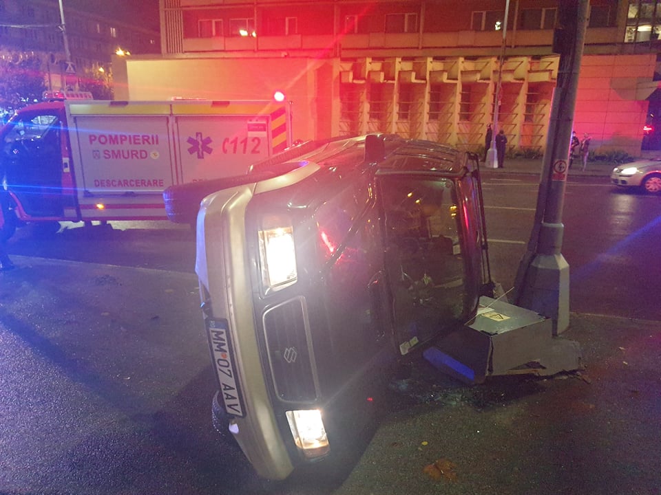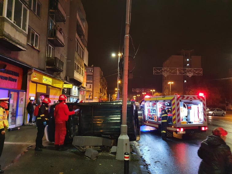 Un autoturism s-a răsturnat pe panoul electric al unui stâlp de curent. Din primele informații a rezultat o victimă posibil încarcerată.