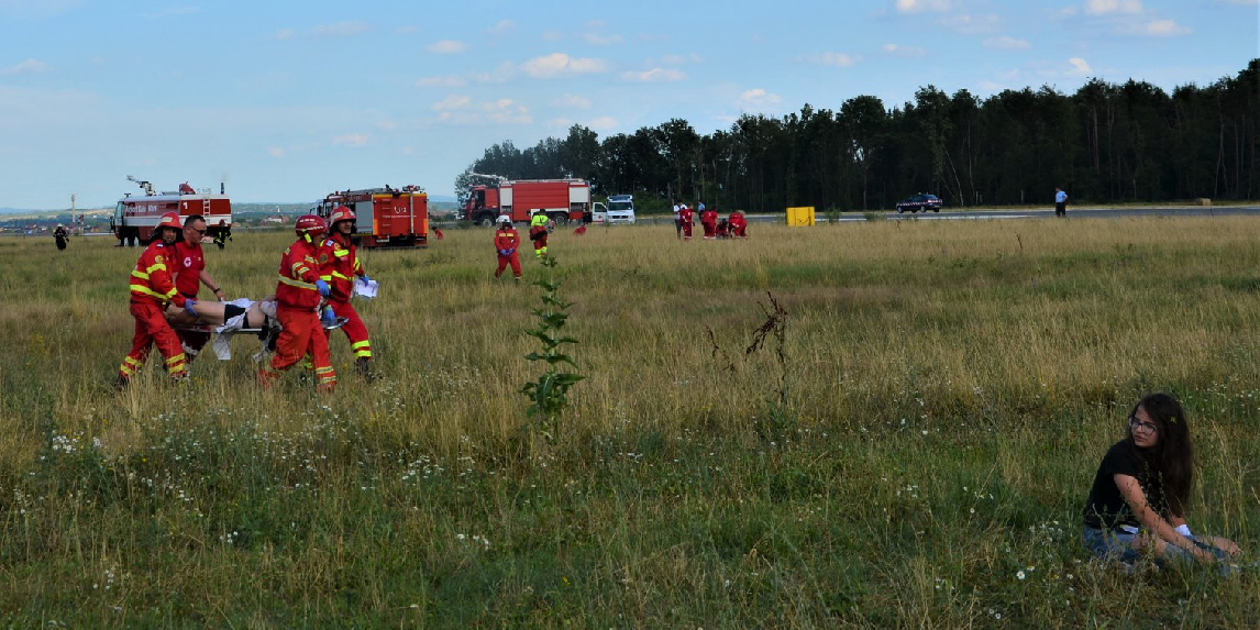- a procedat la activarea planului roșu de intervenție. La locul producerii accidentului s-au deplasat echipaje de intervenție și mijloace tehnice din cadrul Inspectoratului Județean pentru Situații de Urgență ”Gheorghe Pop de Băsești” al județului Maramureș, SMURD Maramureș, Serviciului Județean de Ambulanță Maramureș, Inspectoratului Județean de Jandarmi ”Pintea Viteazu” Maramureș, Inspectoratului de Poliție al Județului Maramureș, Poliției Transporturi Aeriene, grupurile de suport tehnic din cadrul Comitetului Județean pentru Situații de Urgență, voluntari de la Crucea Roșie. S-a primit sprijin pentru desfășurarea exercițiului de simulare de la angajații Serviciului de Trafic Aerian. De asemenea, s-a procedat la alarmarea personalului din turele libere. Echipajele medicale au procedat la triajul și acordarea primului ajutor medical de urgență. Acestea au comunicat identificarea dintre persoanele aflate la bordul aeronavei a patru pasageri decedați, șapte pasageri răniți grav (evaluați la cod roșu), opt pasageri răniți (evaluați la cod galben) și 10 pasageri evaluați la cod verde. Persoanele rănite au fost transportate după acordarea primului ajutor medical și stabilizare la Unitatea de Primiri Urgență a Spitalului Județean de Urgență ”Dr. Constantin Opriș” din Baia Mare.
