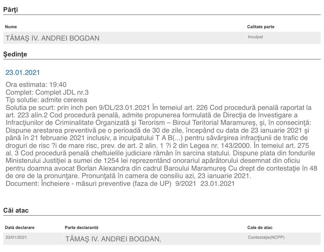 Instanța a admis, în data de 23 ianuarie 2021, propunerea Direcţiei de Investigare a Infracţiunilor de Criminalitate Organizată şi Terorism – Biroul Teritorial Maramureş de arestare preventivă pentru o perioadă de 30 de zile, începând cu data de 23 ianuarie 2021, până la data de 21 februarie 2021 inclusiv, a unui inculpat în vârstă de 23 de ani cercetat sub aspectul comiterii infracţiunii de trafic de droguri de risc și de mare risc, prevăzute de art. 2 alin. 1 și 2 din Legea nr. 143/2000. Pentru a dispune măsura preventivă a arestării, instanţa a reţinut că în cauză există indicii temeinice care să justifice suspiciunea rezonabilă că inculpatul, în data de 22 ianuarie 2021, a deţinut droguri de risc şi de mare risc într-o cantitate nerezonabil de mare pentru a putea fi apreciată ca fiind destinată exclusiv propriului consum, din care o parte au fost deţinute şi transportate cu autoturismul proprietate personală, iar o altă parte au fost deţinute şi descoperite la locuinţa folosită de acesta, în urma efectuării percheziţiei domiciliare autorizate în cauză. Inculpatul a contestat hotărârea, dosarul urmând a fi înaintat Curţii de Apel Cluj pentru soluţionarea căii de atac (vezi mai jos soluția pe scurt).