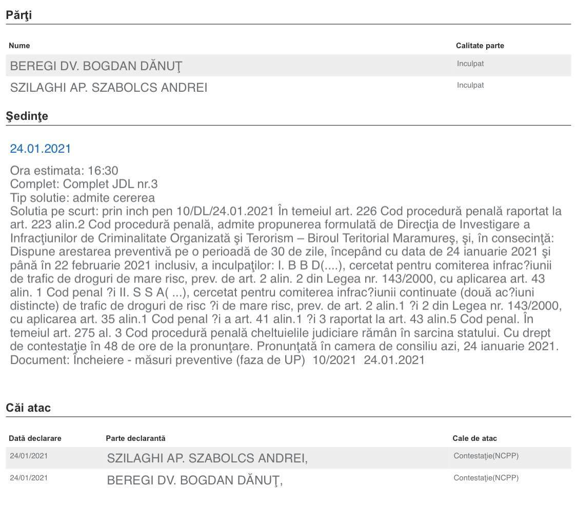 Instanța a admis, în data de 24 ianuarie 2021, propunerea Direcţiei de Investigare a Infracţiunilor de Criminalitate Organizată şi Terorism-Biroul Teritorial Maramureş de arestare preventivă pentru o perioadă de 30 de zile, începând cu data de 24 ianuarie 2021, până la data de 22 februarie 2021 inclusiv, a unui inculpat în vârstă de 27 de ani, cercetat sub aspectul comiterii infracţiunii de trafic de droguri de mare risc, şi a altui inculpat în vârstă de 37 de ani, cercetat sub aspectul comiterii infracțiunii continuate (două acțiuni distincte) de trafic de droguri de risc și de mare risc, reţinând în sarcina acestora indicii temeinice care justifică următoarele suspiciuni rezonabile: Primul inculpat, în data de 23 ianuarie 2021, a procurat de la cel de-al doilea, iar ulterior a deținut și a transportat cantitatea de 101 comprimate de droguri de mare risc MDMA, fiind prins în flagrant în momentul în care dorea să le dea altei persoane. Cel de-al doilea inculpat, în data de 23 ianuarie 2021, a deținut la locuința sa o cantitate mare de droguri de risc și de mare risc, toate găsite cu ocazia percheziției domiciliare efectuate, după ce, în prealabil, în aceeași zi de 23 ianuarie 2021, în jurul orei 17.00, i-a dat inculpatului primului inculpat, pentru a fi transportate și vândute altei persoane cantitatea de 101 comprimate MDMA. Cei doi inculpaţi au contestat hotărârea instanței, dosarul urmând a fi înaintat Curţii de Apel Cluj pentru soluţionarea căii de atac (vezi mai jos soluția pe scurt).