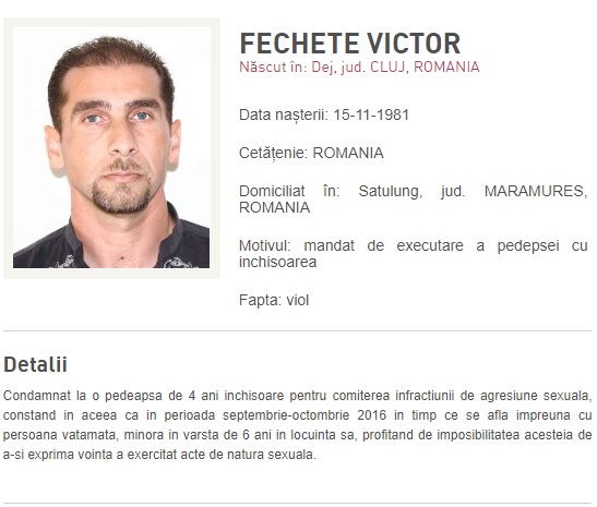 „Condamnat la o pedeapsă de 4 ani închisoare pentru comiterea infracțiunii de agresiune sexuală, constând în aceea că în perioada septembrie-octombrie 2016, în timp ce se afla împreună cu persoana vătămată, minora în vârstă de 6 ani în locuința sa, profitând de imposibilitatea acesteia de a-și exprima voința, a exercitat acte de natură sexuală”, se arată pe site-ul Poliției Române.