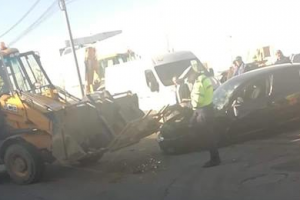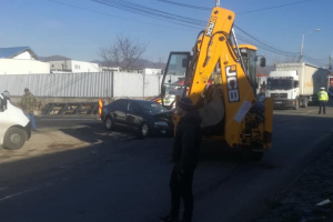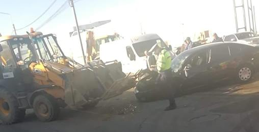 Ciocnire dezechilibrată: buldoexcavator cu lamă versus autoturism (GALERIE FOTO)