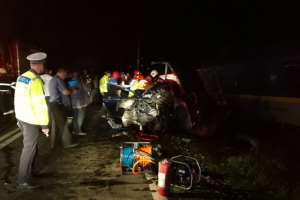 O mașină a intrat pe contrasens, a intrat în coliziune cu alta care circula regulamentar, proiectând-o în afara părții carosabile, taman pe calea ferată. Imediat a fost lovită de tren. În fiecare mașină erau câte două persoane și toate patru – o femeie și trei bărbați – au fost rănite grav: două sunt conștiente, una semiconștientă și alta inconștientă. Accidentul rutiero-feroviar a avut loc aseară, în localitatea bistrițeană Feldru. În trenul nr. 1765 (Iași-Timișoara) erau 250 de călători, dar niciunul nu a fost rănit. Însă trenul va avea o întârziere de 2-3 ore, fiindcă a fost necesară schimbarea locomotivei, afectată și ea de impact