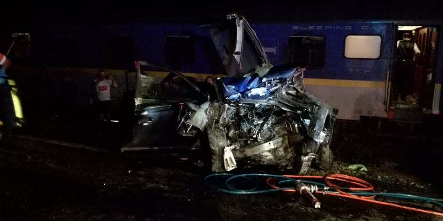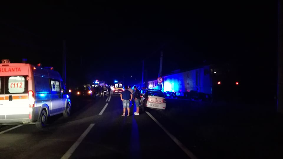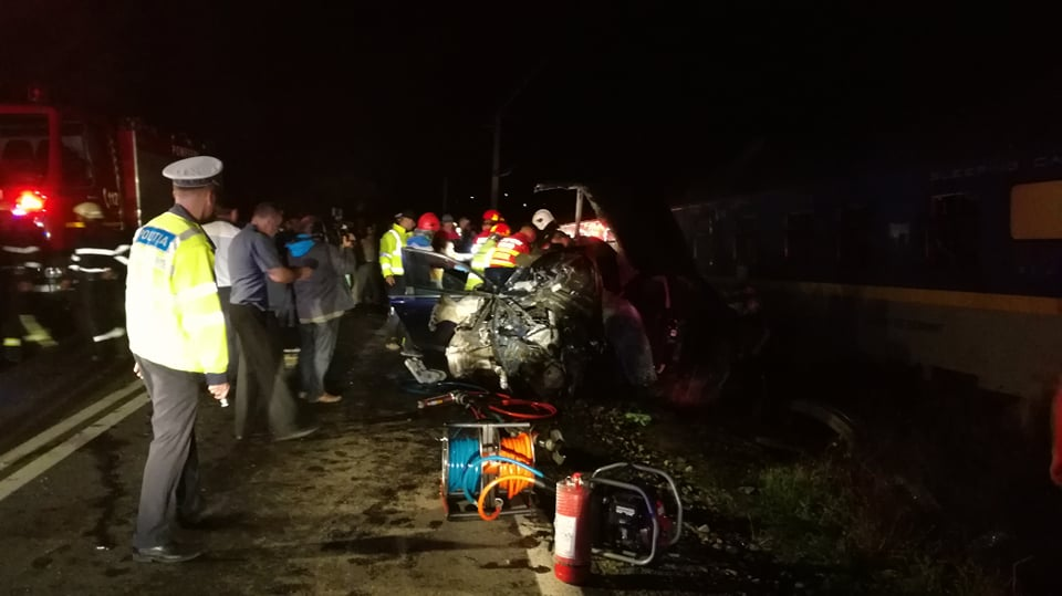 Din ciocnirea a două mașini, una a fost proiectată pe calea ferată, unde a fost lovită și de tren (GALERIE FOTO)
