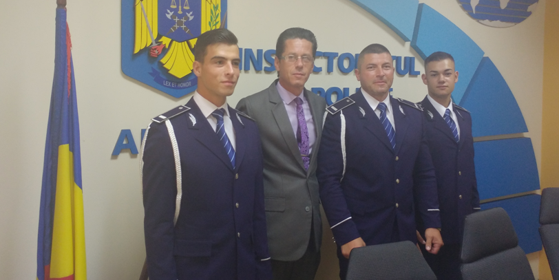 Poliţiştii maramureşeni i-au primit în rândurile lor pe trei absolvenţi ai Şcolii de Agenţi de Poliţie „Septimiu Mureşan” Cluj Napoca. Maramureşeanul Gheorghe Dorel Ţiplea, şeful de promoţie, își va începe cariera în cadrul Biroului de Investigaţii Criminale din cadrul Poliţiei Municipiului Baia Mare. Agenţii de poliţie Mihai Grigore Mureşan şi Ionuţ Andrei Şuşca vor face parte din echipa luptătorilor din cadrul Serviciului Acţiuni Speciale. Iată-i în poza de start, alături de comisarul șef de poliție Liviu-Constantin Grozavu, împuternicit sef al Inspectoratului de Poliție al Județului Maramureș.