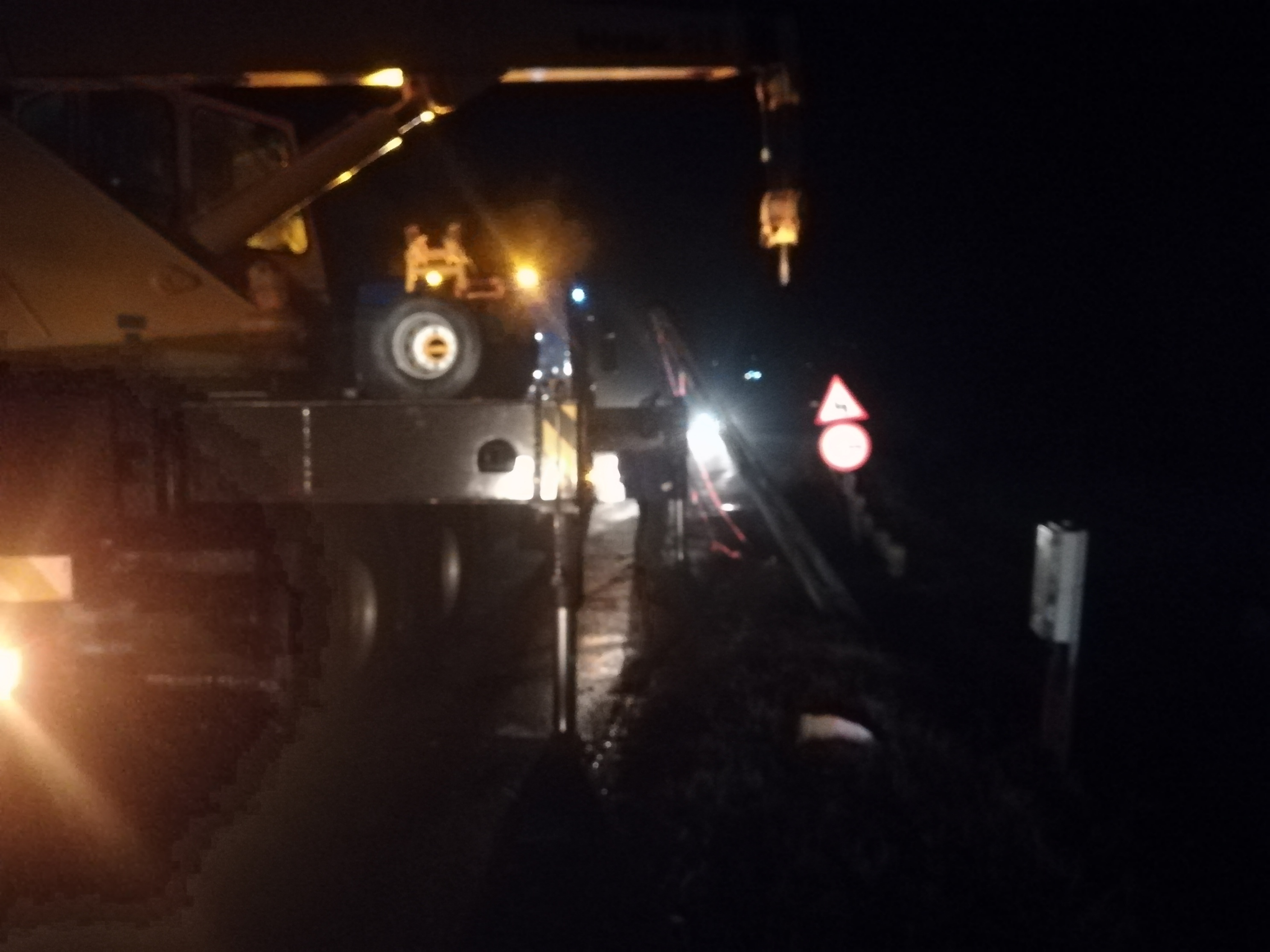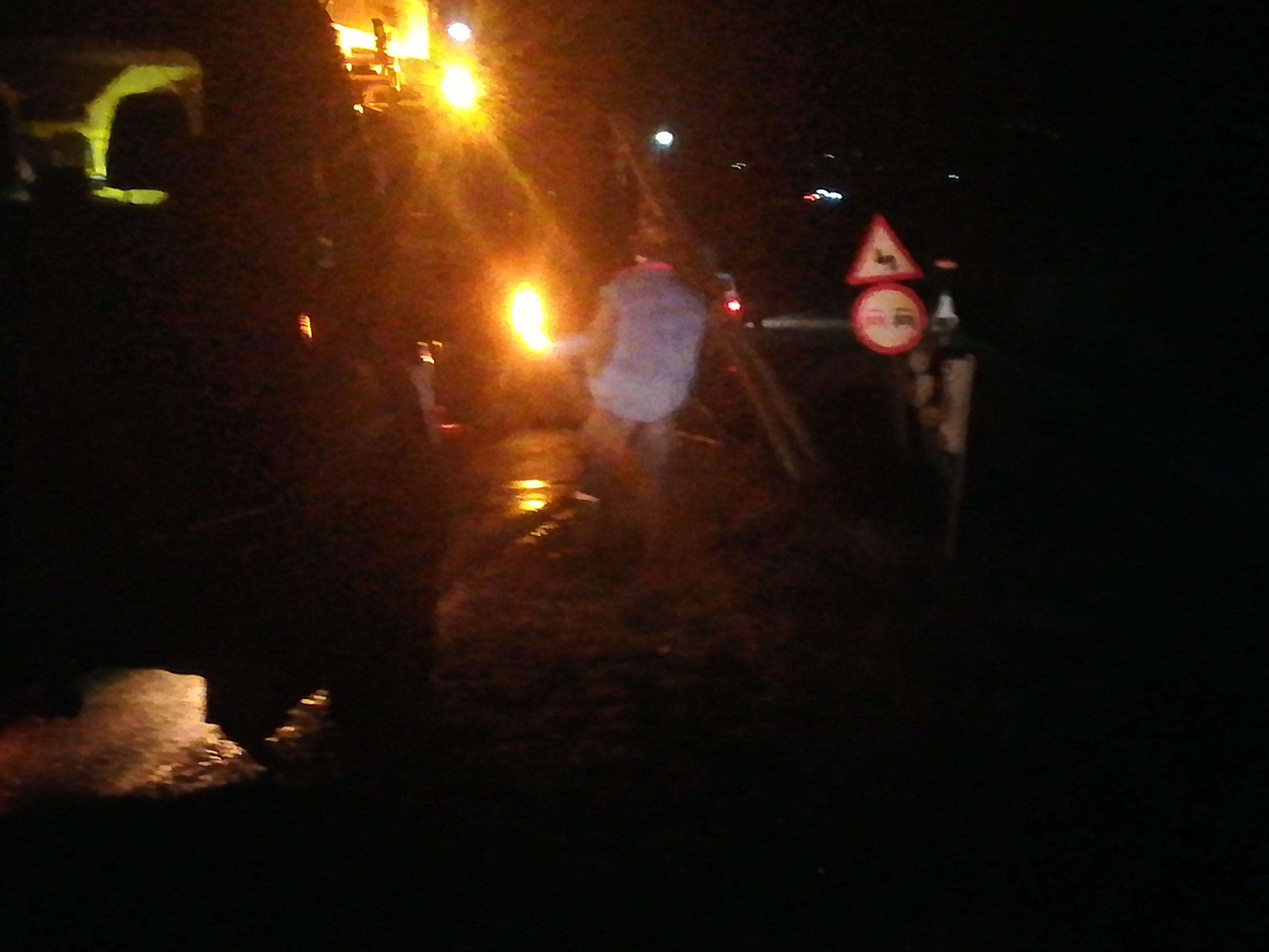 Un stâlp de electricitate s-a înclinat periculos deasupra drumului, la ieșirea din localitatea Groși, acolo unde încep curbele spre dispărutul Popas Regal. Este zona în care, cu ani în urmă au avut loc alunecări de teren. Pe fondul ploii, care a îmbibat terenul, stâlpul s-a înclinat la circa 45 de grade înspre carosabil, cu tendință de a-și continua înclinarea. Fără o intervenție rapidă, s-ar fi prăbușit pe drumul foarte circulat la această oră, putând genera o tragedie. Din fericire, două utilaje au sosit prompt la fața locului și acum (în jurul orelor 18.45) îndreaptă și ancorează stâlpul. Cât timp va mai dura intervenția, în dreptul celor două utilaje se circulă pe o singură bandă.