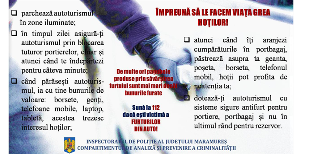 „Orice bun este o tentaţie pentru hoţi. Atenţia şi vigilenţa sunt esenţiale! Siguranţa bunurilor tale este responsabilitatea ta. Dacă fiecare ar acorda atâta atenţie bunurilor proprii câtă le acordă hoţii s-ar reduce mult victimizarea, pentru că aceştia ar fi descurajaţi. Dacă laşi bunurile de valoare la îndemâna hoţilor ești complice, nu victimă!”, atrag atenția reprezentanții IPJ Maramureș.