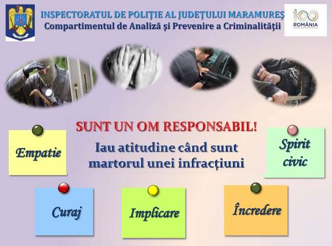 ● Sesizaţi 112 de fiecare dată când sunteţi martorii unei infracţiun ● Nu interveniţi atunci când consideraţi că vă este pusă în pericol viaţa şi integritatea corporală, dar încercaţi să reţineţi cât mai multe semnalmente şi detalii ale autorilor; sunt aspecte de un real folos poliţiştilor care investighează cazul ● Neimplicarea comunităţii protejează infractorii, a căror victimă puteţi fi oricând şi dumneavoastră.