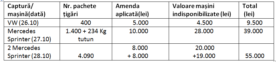 În contrabanda cu țigări se folosesc, deseori, mașini care au spații special amenajate pentru ascunderea țigărilor, caz în care autoritățile dispun nu doar confiscarea țigărilor, ci și imobilizarea/confiscarea acestor mașini. Din această cauză, în acest fel de contrabandă se folosesc, de regulă, rable cu valori cât mai mici. Dar sunt și destule excepții. Astfel se ajunge ca daraua să fie mai mare decât ocaua. Exemplificăm sintetic cu capturile efectuate în trei zile consecutive la diverse sectoare de frontieră din subordinea ITPF Sighetu Marmației. E vorba de aproape 6000 de pachete de țigări, descoperite în patru mașini – un VW și trei Mercedes Sprinter – care aveau locuri special amenajate în pereții, plafoniera sau podeaua mașinii. Doar prin amenzi și prețul autovehiculelor confiscate, țigările ajung să-i coste pe contrabandiști și de 10 ori mai mult. Nici nu am mai luat în calcul valoarea propriu-zisă a țigărilor, ce diferă în funcție de marcă, ci doar ”cheltuielile” adiacente.
