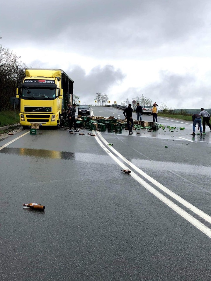 Există două variante. Ori șoferul a luat curba în viteză, ori TIR-ul era prea încărcat și a intrat în balans. Cert este că marfa nu a fost foarte bine asigurată, din moment ce „a sărit” pe șoseaua națională. Au rămas numai cioburi de sticlă și bere pe asfalt.