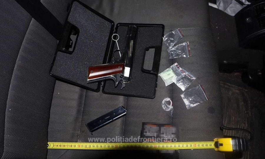În urma verificărilor specifice efectuate asupra autoturismului și a șoferului, polițiștii de frontieră au descoperit în mașină trei pliculețe de tip zip-lock, care conțineau o substanță cristalizată translucidă și o armă neletală – un pistol cu inscripția Automatic Bruni cal. 8 mm de producție italiană, fără serie, cu încărcător și care conținea două cartușe fără proiectil, nepercutate.