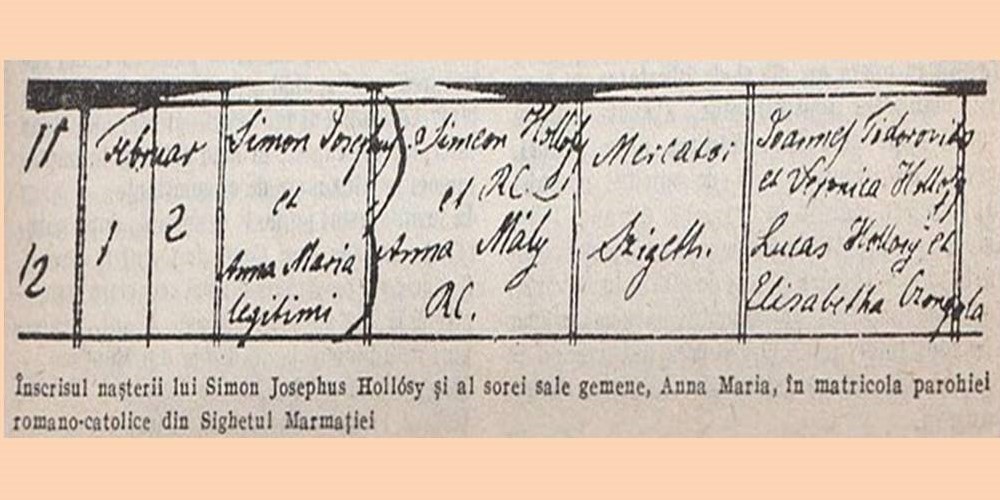 Înscrisul nașterii lui Hollosy Simon și a surorii sale, Anna Maria, în matricola parohiei romano-catolice din Sighetu Marmației