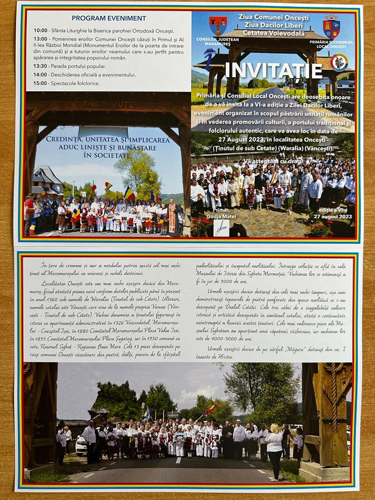 „Primăria și Consiliul local Oncești invită toți onceștenii, moroșenii și românii din țară și de pretutindeni să îmbrace haina tradițională și să participe la sărbătoare “Ziua Dacilor Liberi” în scopul de a păstra unitatea, credința, portul popular și folclorul autentic din Ținutul de Sub Cetate WARALIA (Văncești) comuna Oncești Maramureș. Eveniment ce va avea loc în data de 27 August 2023. Vă așteptăm cu drag!”, arată autoritățile din Oncești.
