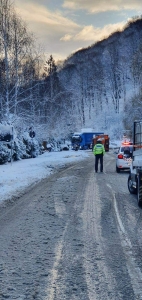 ACTUALIZARE 2 – Actualizare stare practicabilitate sectoare de drumuri naționale la orele amiezii: zăpadă frământată cu grosimea de până la 1 cm se găsește pe partea carosabilă a DN 18, în Pasul Prislop, între km 160 si km 180. Celelalte sectoare de drumuri naționale au carosabilul curat și umed. Vizibilitatea în trafic este redusă de ceață, pe DN18, în Pasul Prislop, între km 160 și km 175, sub 100 de metri. Tot aici vântul prezintă intensificări temporare de până la 40 km/h. Cerul este acoperit. Fulguiește în zona de deal și de munte în județ. Angajații secției de drumuri naționale au acționat cu 11 utilaje și au împrăștiat 62 tone de material antiderapant, arată Dan Bucă, purtătorul de cuvânt al CJSU Maramureș.