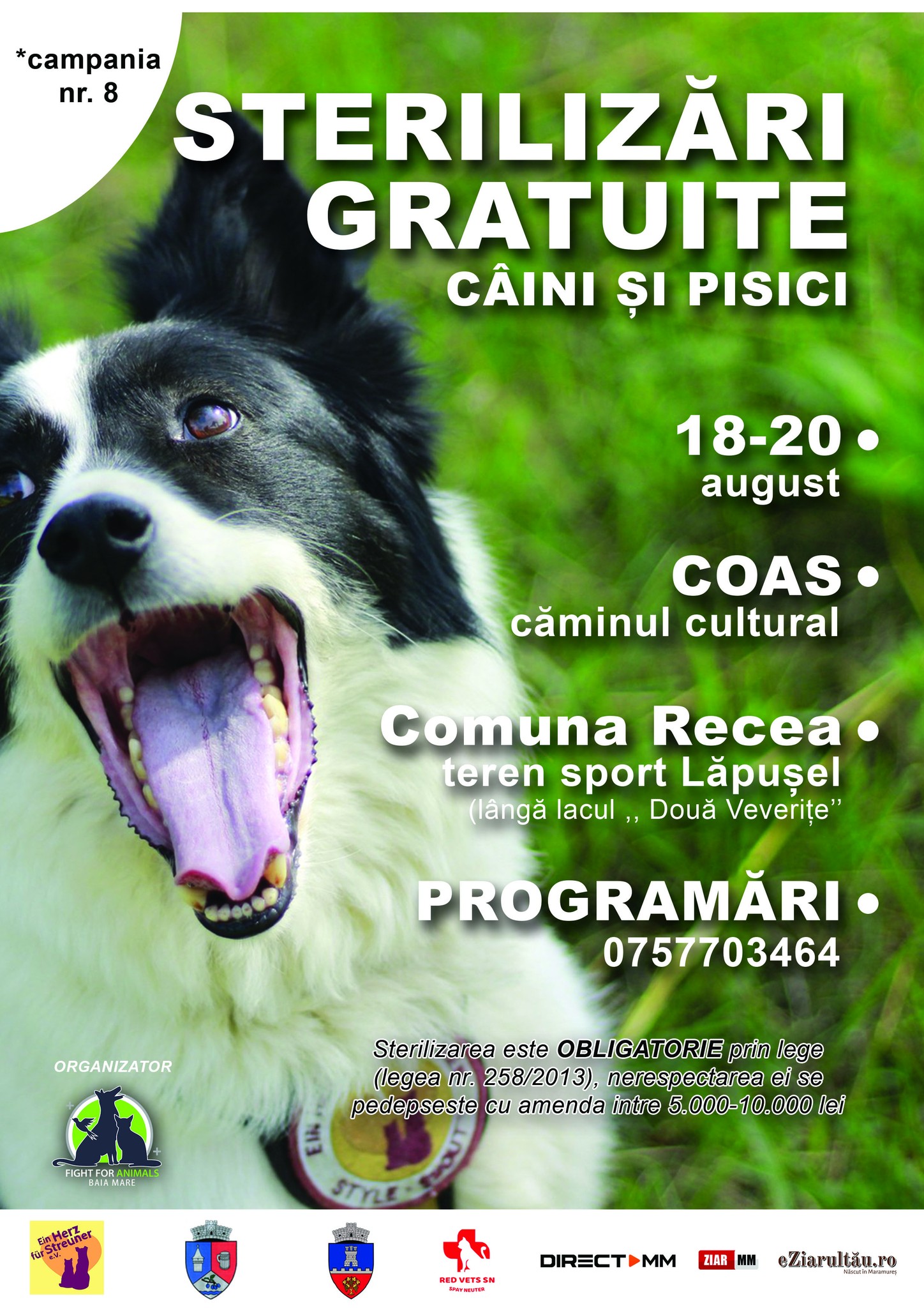 „Acțiunea va avea loc în data de 18 August în Comuna Coaș (Căminul Cultural) și 19 – 20 August în Comuna Recea (teren sport, lângă lacul „Două Veverițe”). În cazuri excepționale, pentru animalele fără stăpân vom asigura transportul pe raza Comunei Recea! Sterilizarea este obligatorie prin lege! Intervenţiile vor fi efectuate de către Red Vets Spay Neuter. Este foarte important să nu hrăniti animalele cu 12 ore inainte de intervenţie! Sponsori: Ein Herz für Streuner e.V., Primăria Comunei Coaș, Primăria comunei Recea. Luptăm pentru a pune capăt suferinţei animelelor!”, mai arată reprezentanții asociației băimărene.