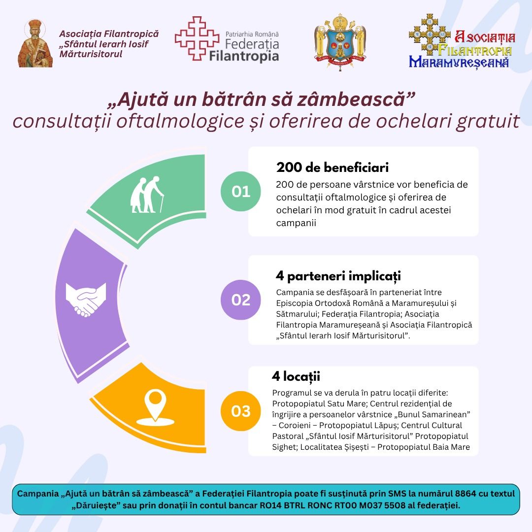 Cu binecuvântarea Preasfințitului Părinte Episcop Iustin, în perioada 8-11 octombrie, în Episcopia Ortodoxă Română a Maramureșului și Sătmarului se desfășoară Campania „Ajută un bătrân să zâmbească”, componenta – „consultații oftalmologice și oferirea de ochelari gratuit”, pentru 200 de persoane vârstnice, campanie susținută de către Federația Filantropia.
