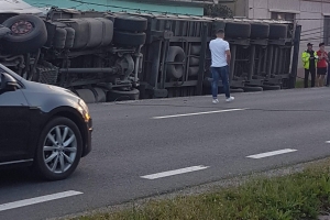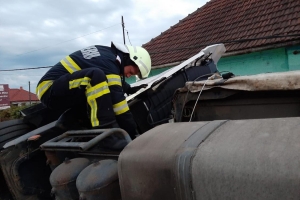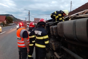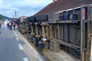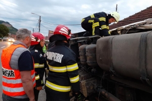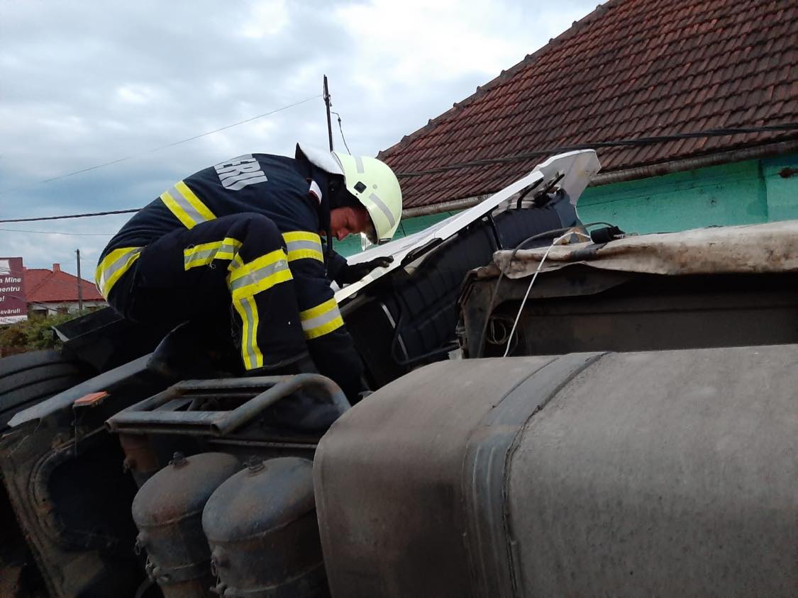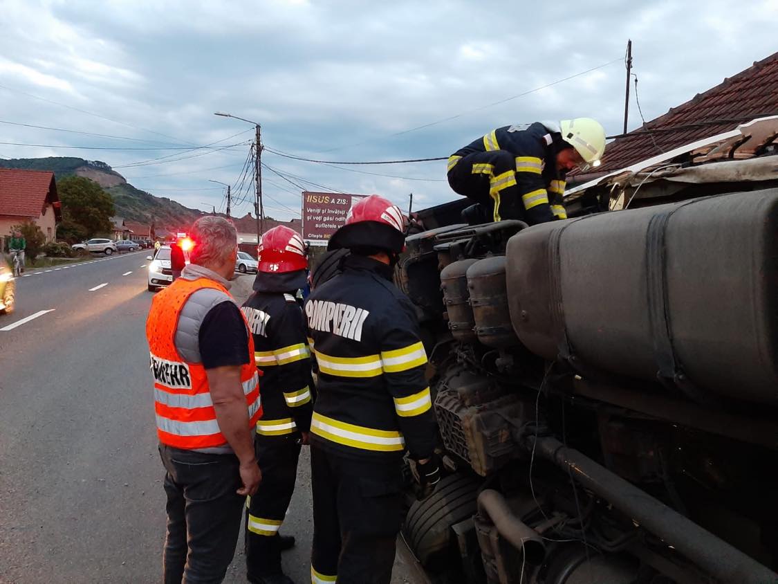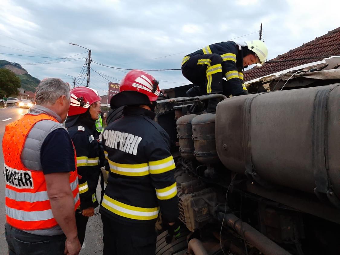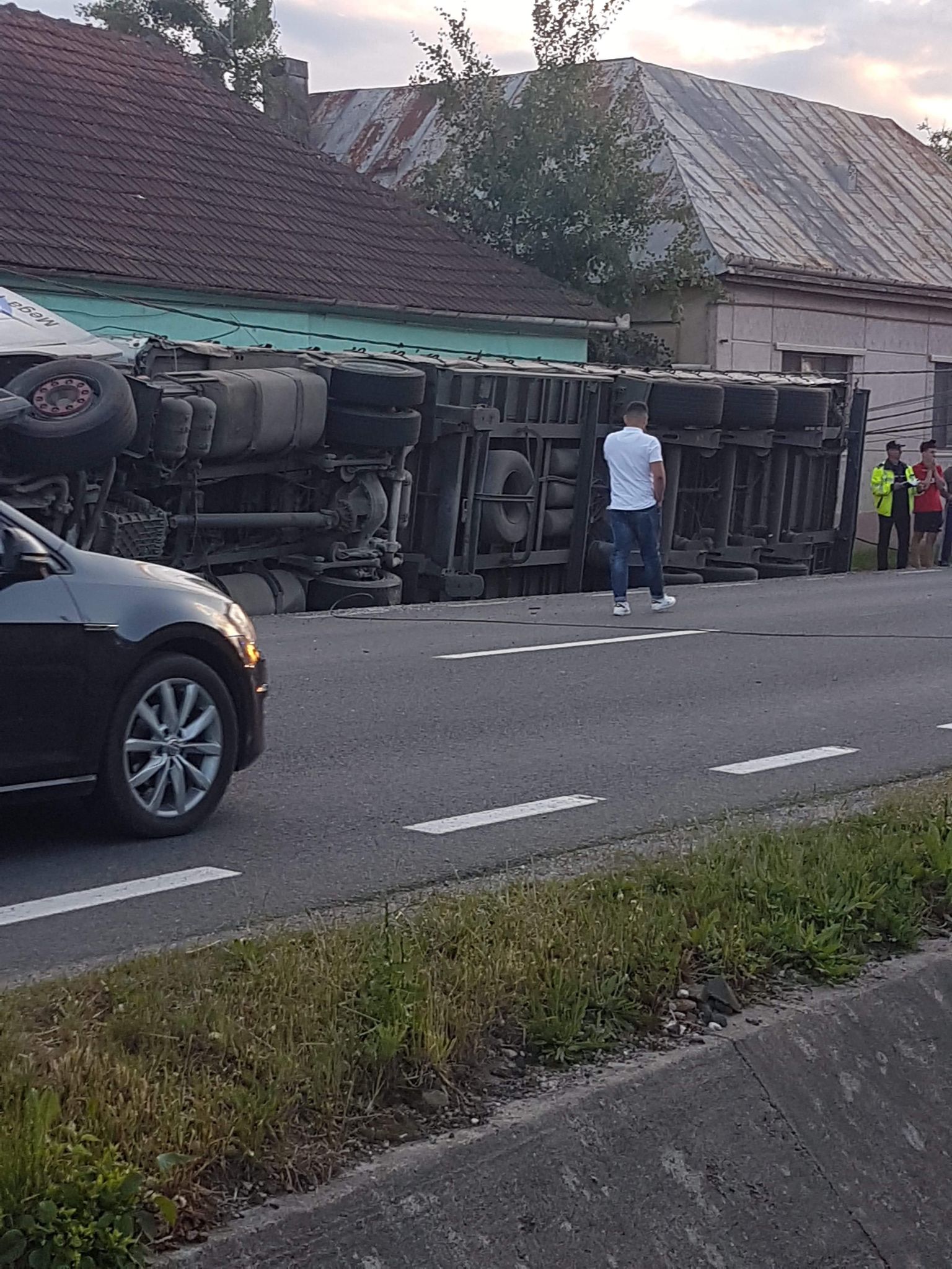 ACTUALIZARE 2 – Din nefericire, un pieton care se afla pe trotuar atunci când TIR-ul s-a răsturnat a fost prins sub remorcă și și-a pierdut viața. Șoferul are alcoolemie de 1,22 mg/l alcool pur în aerul expirat.