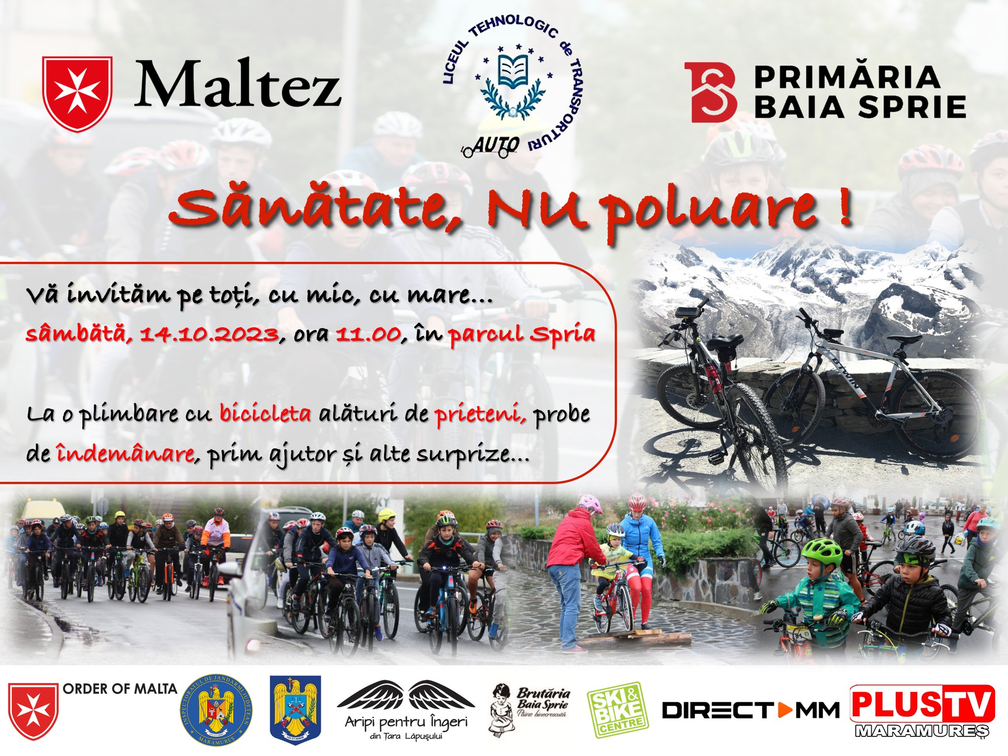 Serviciul de Ajutor Maltez Baia Mare, în parteneriat cu Liceul Tehnologic de Transporturi Auto Baia Sprie și Orașul Baia Sprie, organizează sâmbătă 14.10.2023, între orele 11.00 și 14.00, în Parcul Spria, evenimentul Sănătate, NU poluare!.