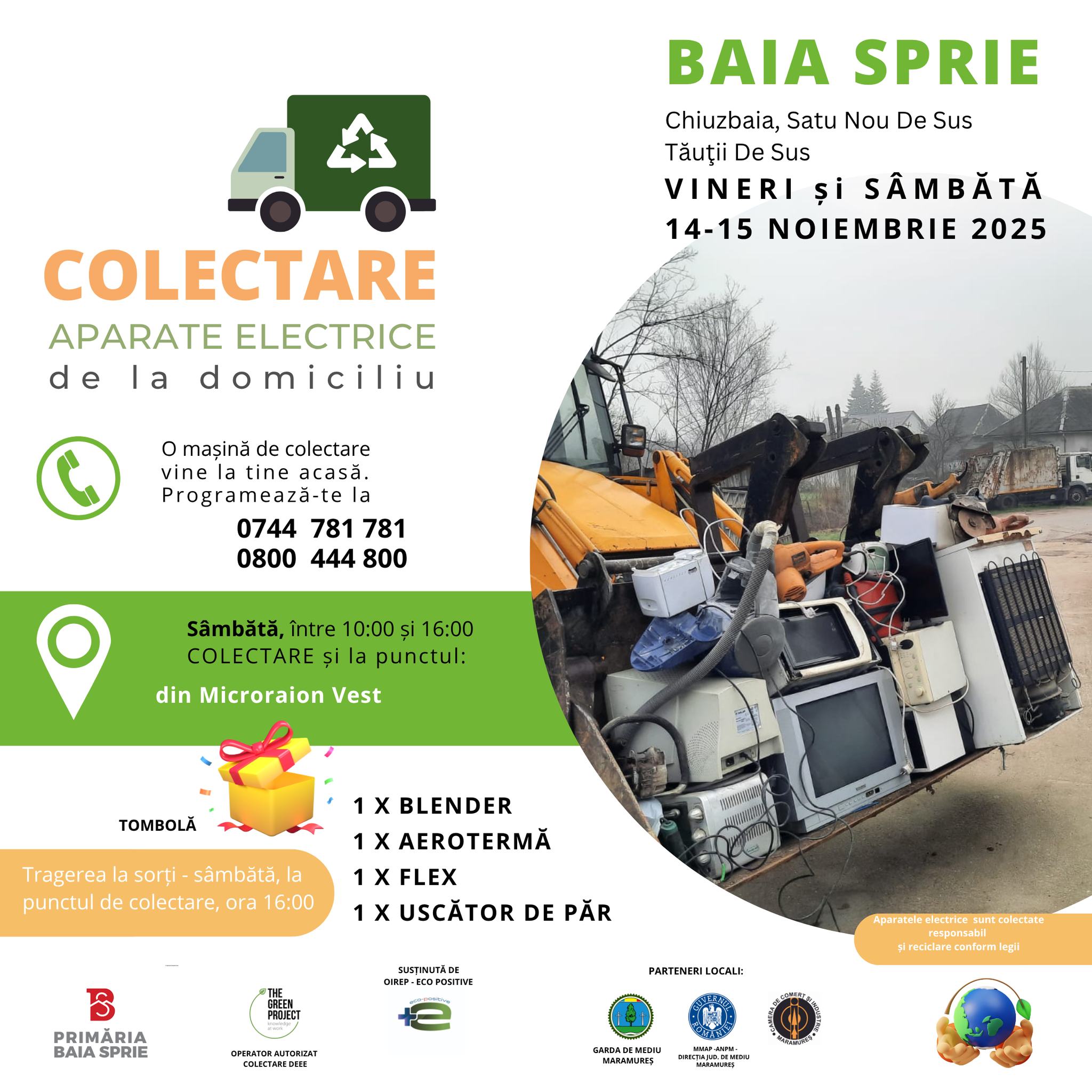 Vineri și sâmbătă se va colecta între orele 10:00 și 16:00 la mașinile care vor circula prin Baia Sprie și localitățile aparținătoare – Chiuzbaia, Satu Nou de Sus, Tăuţii de Sus. Sâmbătă se va colecta între orele 10:00 și 16:00 atât la mașini, cât și la punctul de colectare din Microraion Vest.