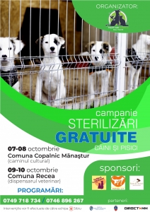 Acțiune pentru prietenii noștri!În județul Maramureș anunț important pentru iubitorii de pisici și câini!Din 7 și 9 octombrie campanie de sterilizări gratuite!