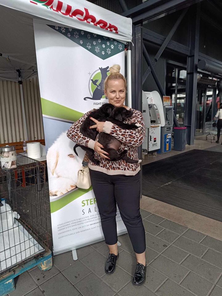 Evenimentul a avut loc la Auchan, sâmbătă și duminică, între 10,00 și 17,00. Ei bine, sâmbătă, la ora 13,00-14,00, încă nu se înregistrase nicio adopție. Imediat, s-au înregistrat două adopții dintr-un foc. Două cățelușe abandonate într-o parcare din Cavnic au fost adoptate împreună de doamna Sanda Bozga, iar la șase luni vor fi sterilizate. Așadar, și-au găsit căsuță și familie împreună!