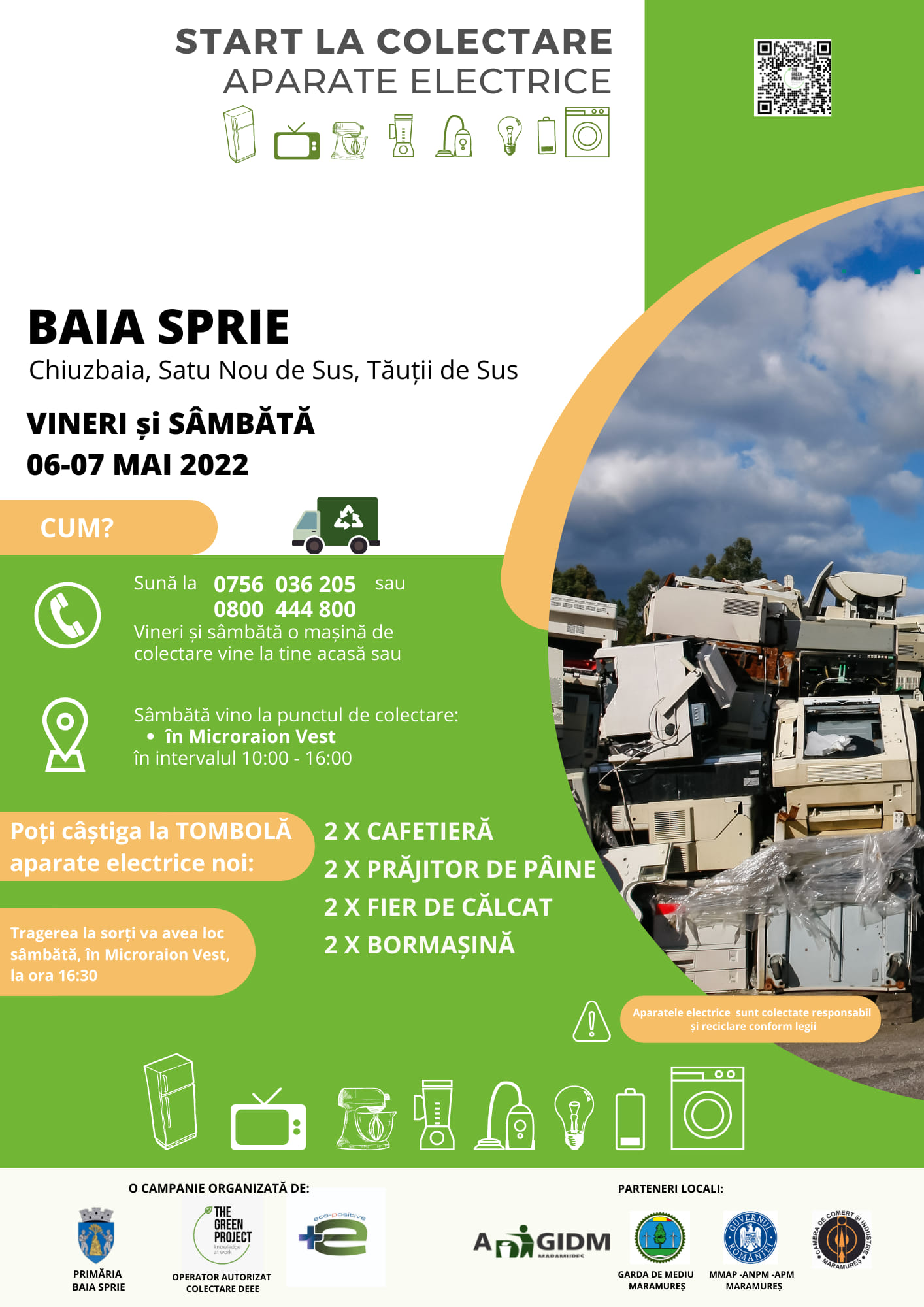 Toți cei care vor apela la serviciul de colectare din cadrul campaniei pot câștiga prin tragere la sorți unul dintre premiile constând în echipamente electrice și electrocanice noi: 2 x Cafetieră, 2 x Prăjitor de pâine, 2 x Fier de Călcat, 2 x Bormașină. Vineri și sâmbătă se va colecta între orele 10:00 și 16:00 la mașinile de colectare care vor circula prin Orașul Baia Sprie și localitățile aparținătoare: Chiuzbaia, Satu Nou de Sus, Tăuții de Sus. Tragerea la sorți va avea loc sămbătă, ora 16:30, în Microraion Vest.